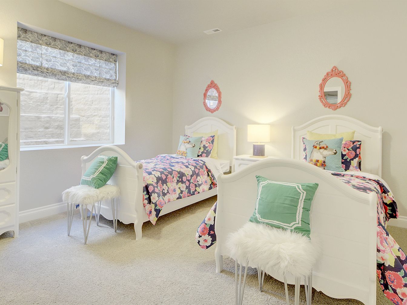This cozy guest bedroom features two elegant white beds with floral-patterned quilts, enhancing a cheerful atmosphere. The walls are painted a soft neutral hue, providing a calm backdrop for the vibrant bedding. Each bed is adorned with colorful accent pillows, adding playful touches. A pair of decorative coral mirrors hangs above the beds, reflecting light and enhancing the room’s spacious feel. The large window, dressed in patterned shades, invites natural light, brightening the space. A small furry stool with clear legs serves as unique seating, while a modern bedside lamp adds a contemporary element, creating a harmonious blend of styles.