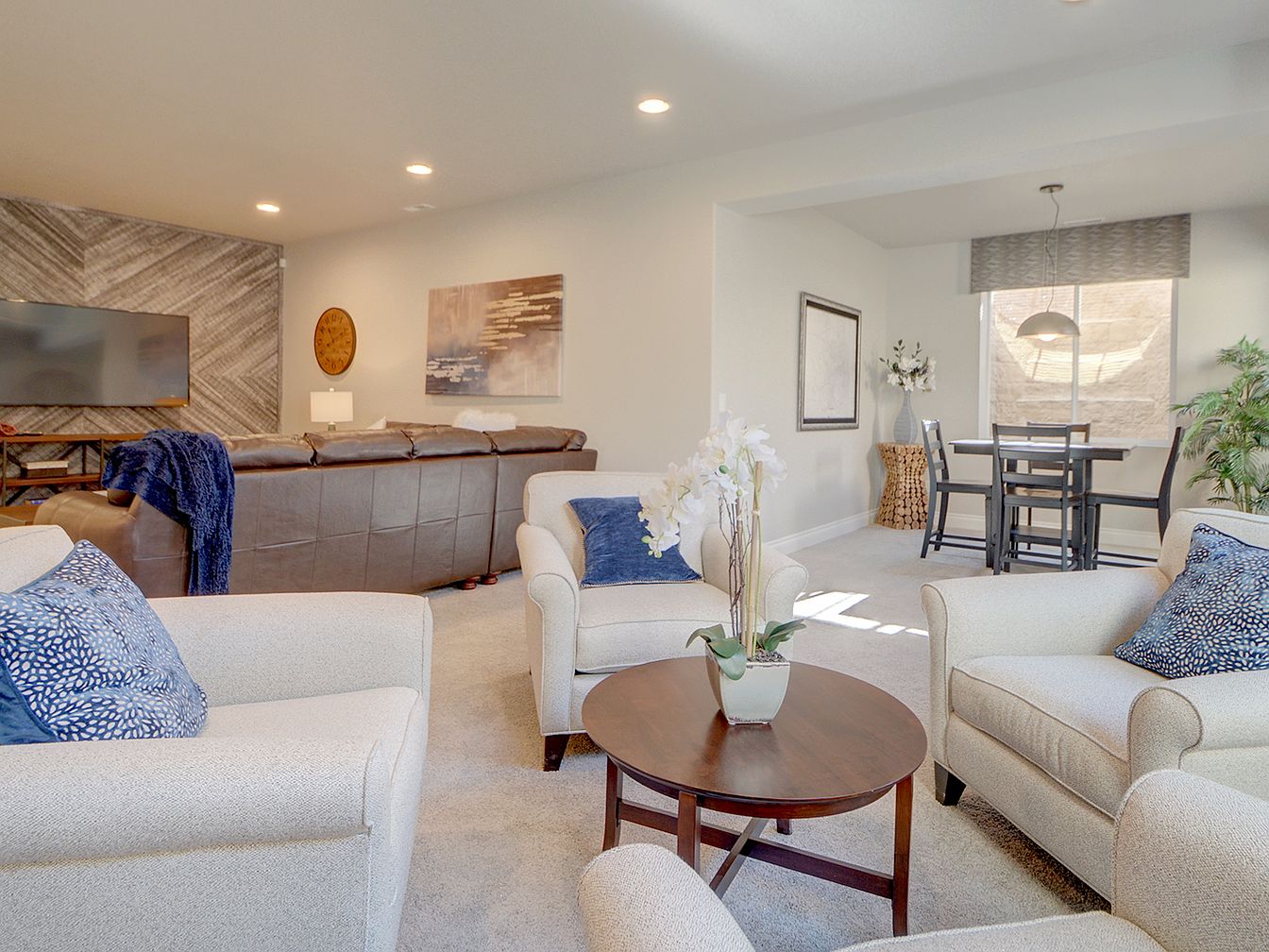A spacious living room with an open layout featuring light-colored carpet. Two comfortable cream-colored armchairs with decorative blue pillows face each other around a round wooden coffee table. A large dark leather sectional sofa is positioned against a stylish herringbone-pattern accent wall, enhancing the contemporary feel. A flat-screen TV is mounted on the wall, accompanied by a round wall clock. To one side, a dining nook offers a rectangular black table surrounded by matching chairs, illuminated by a modern pendant light above. Natural light streams in through a window, highlighting the greenery from a nearby potted plant.