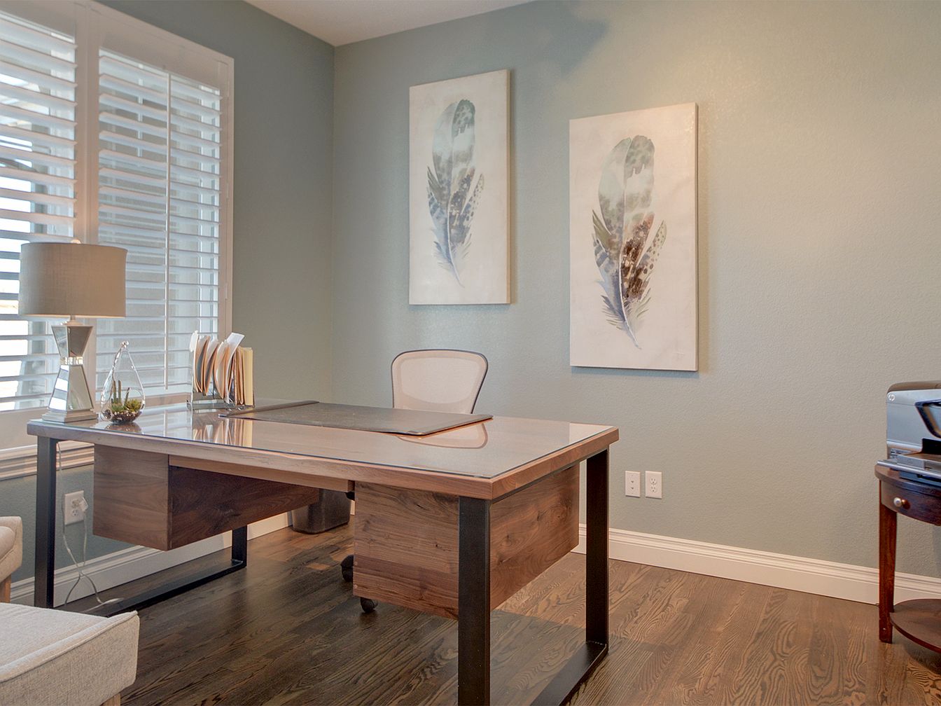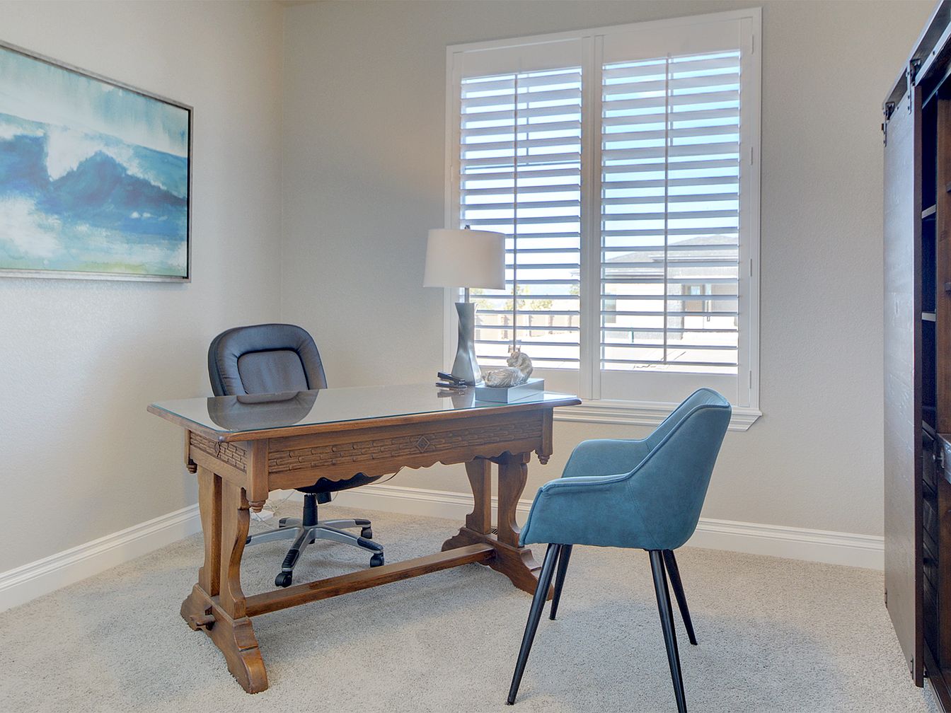 This home office features a thoughtfully arranged workspace highlighted by a sleek wooden desk with intricate detailing. A modern black office chair contrasts elegantly with the textured light blue upholstery of the accent chair nearby. The wall is adorned with an abstract ocean-themed painting, contributing to a serene atmosphere. Light filters through plantation shutters, adding a touch of sophistication while allowing natural illumination. The soft gray walls and plush carpet enhance the room’s comfortable ambiance. A small decorative lamp sits on the desk, complementing the overall clean and inviting aesthetic of this organized workspace.
