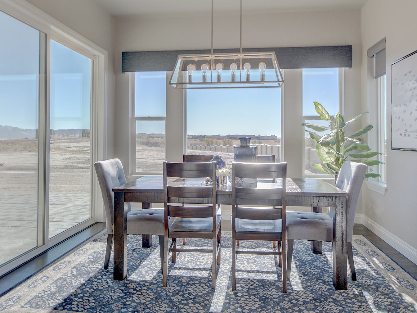 A contemporary dining area features a wooden table with four chairs set against large windows that allow natural light to flood the space. The color palette combines earthy tones with a hint of blue in the decorative accents. Overhead, a modern chandelier with exposed bulbs adds an industrial touch. A vibrant area rug in shades of blue and cream creates a soft foundation and defines the dining space. Potted greenery adds life, while a simple vase with flowers serves as a thoughtful centerpiece. The minimalist design emphasizes spaciousness, highlighting views of the outdoors beyond the glass doors.