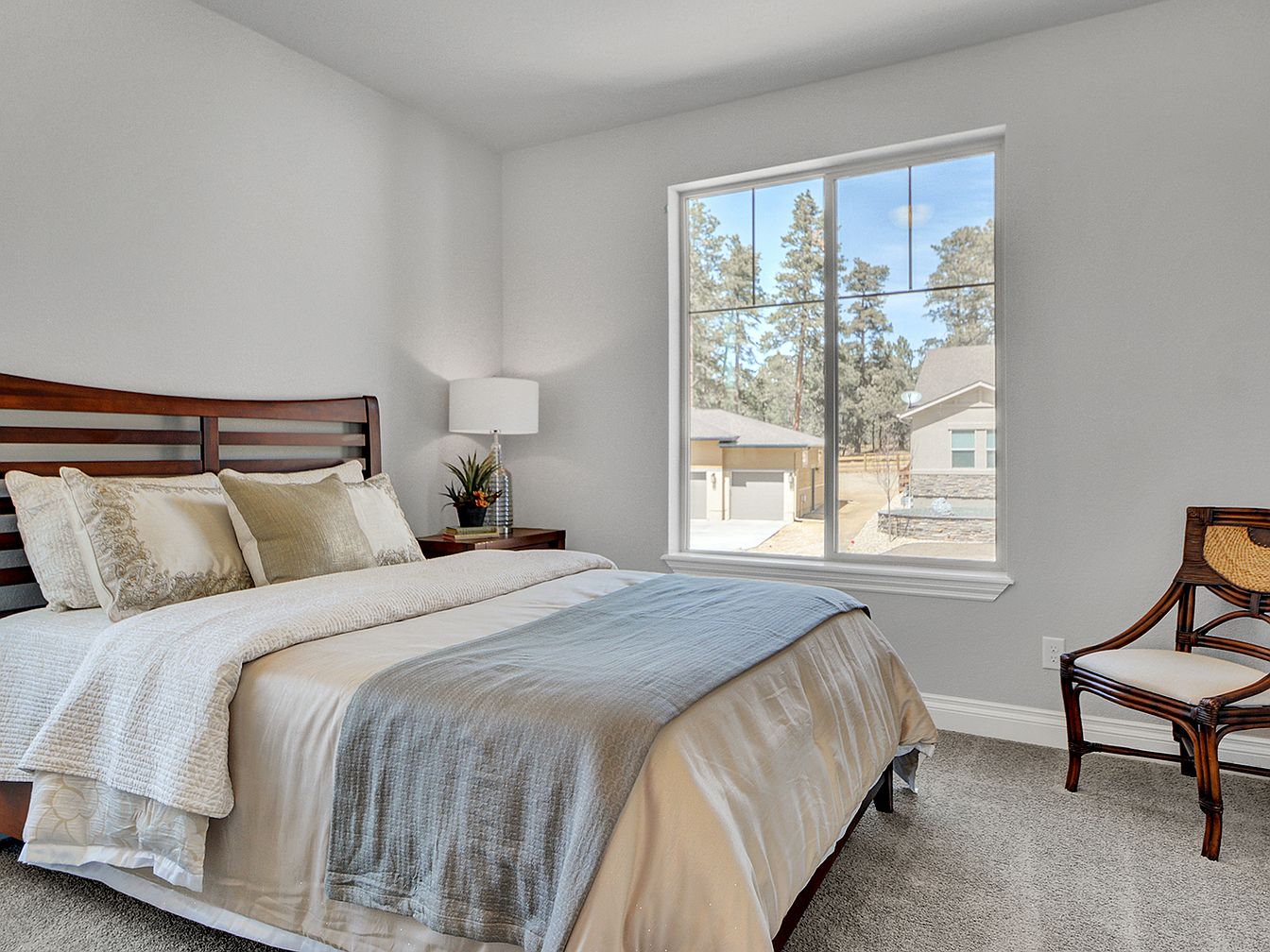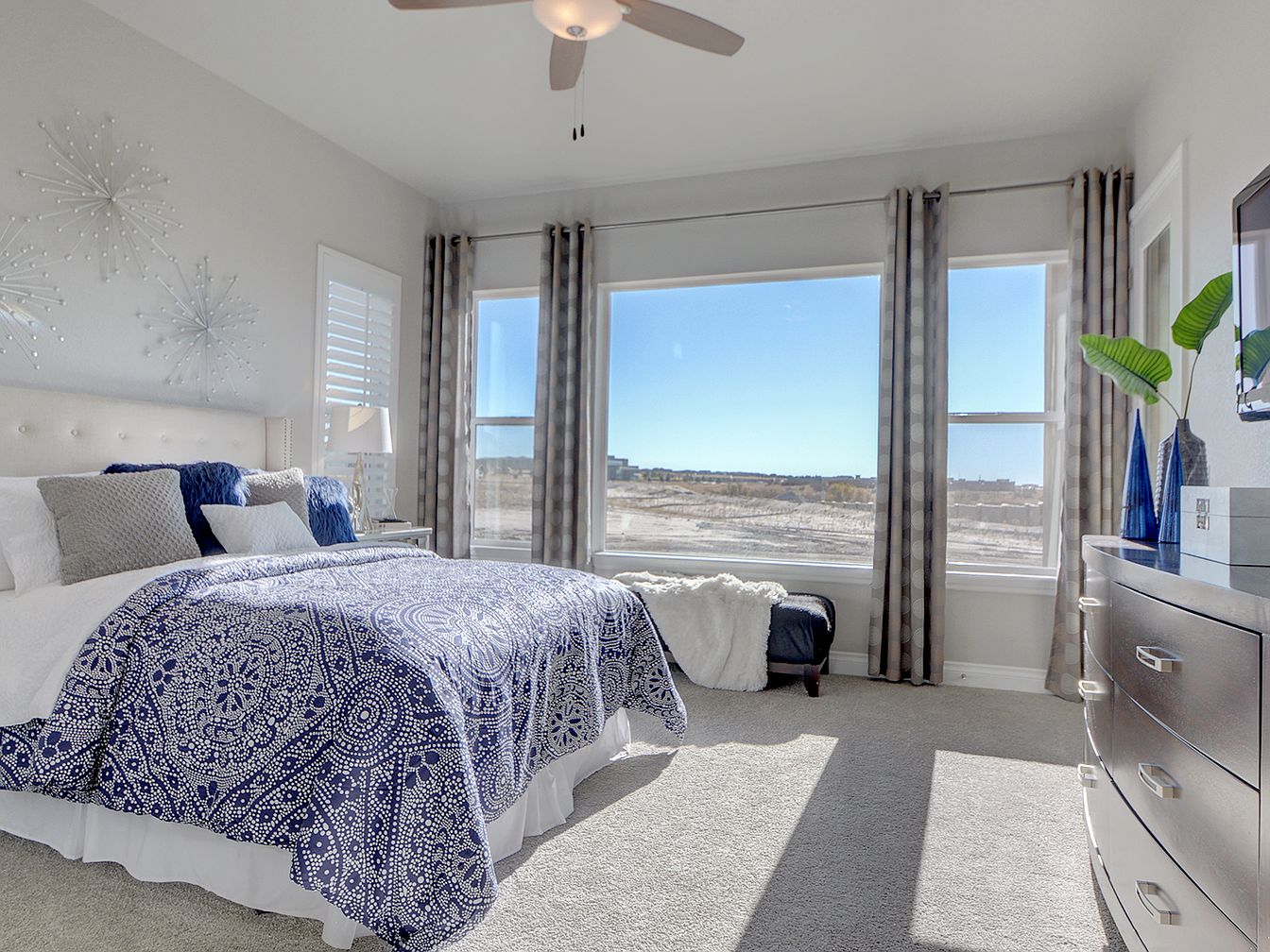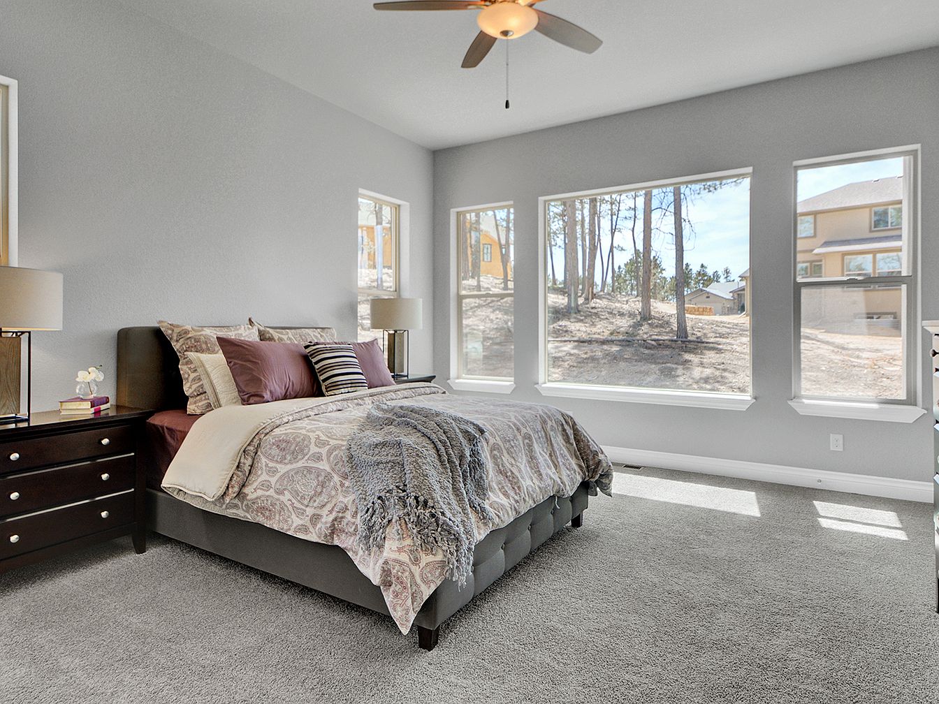 This spacious bedroom features a modern aesthetic with a soothing gray color scheme. A stylish bed, adorned with patterned and solid pillows, takes center stage, complemented by a light blanket and a soft throw. Flanking the bed are two dark wooden nightstands, each topped with elegant lamps that offer ambient lighting. The large windows bring in natural light and provide a view of the surrounding landscape, enhancing the open feel of the room. The plush carpet adds to the comfort, while the ceiling fan ensures airflow, creating a tranquil and inviting atmosphere ideal for relaxation.
