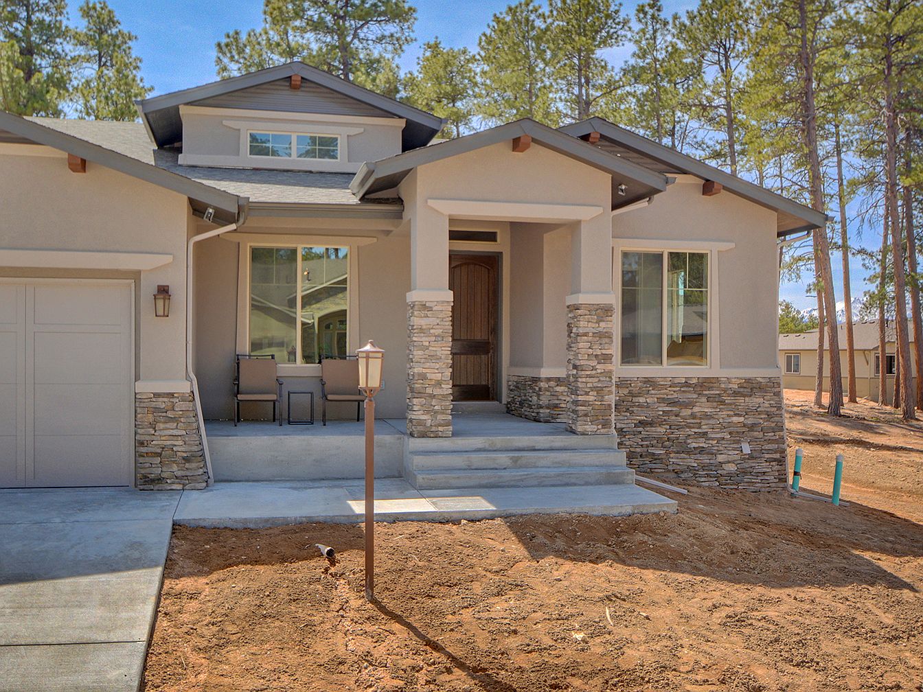 The front entrance features a modern design with a welcoming vibe. Neutral-colored stucco walls are complemented by stone accents at the base, adding texture and depth. A wooden front door serves as a focal point, flanked by large windows that offer expansive views and natural light. The porch area includes two contemporary chairs, creating a cozy seating arrangement. Steps lead up to the entrance, flanked by a stylish lamp post, enhancing the home’s curb appeal. Surrounding pine trees provide a lush backdrop, while the freshly cleared dirt hints at future landscaping, integrating nature into the aesthetic.