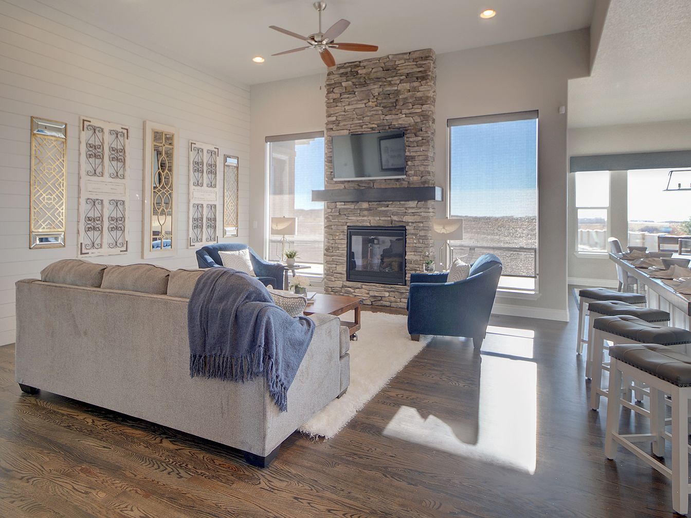 This living room showcases a contemporary design with an open layout. A plush grey sofa, adorned with a dark throw, invites relaxation. Opposite stands a striking stone fireplace, framed by large windows that allow natural light to flood the space. Accent pieces include elegant, metallic-framed wall décor and deep blue chairs, adding a pop of color. The hardwood flooring complements the soft white area rug beneath the coffee table, enhancing warmth. A modern ceiling fan circulates air, while a sleek bar area can be seen in the background, completing the inviting atmosphere of this stylish gathering space.