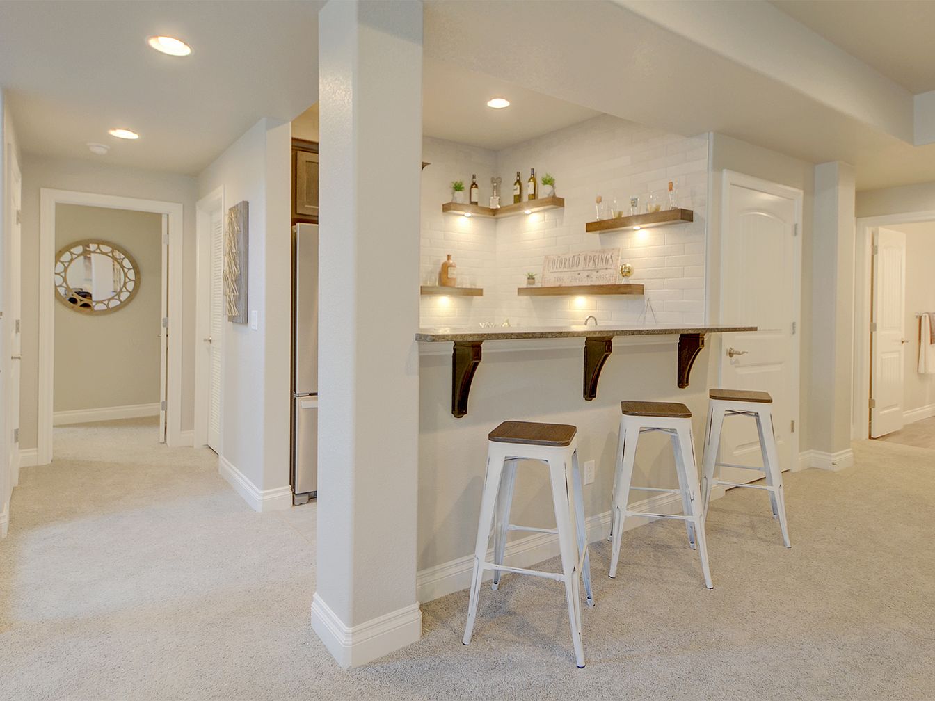 This is a stylish bar area featuring a sleek counter crafted from dark stone. The backdrop consists of white subway tiles, which create a crisp, clean aesthetic. Three modern bar stools with wooden seats and metal bases stand in front of the counter, inviting casual seating. Ambient lighting illuminates the shelves above, showcasing various bottles and decorative items. The walls are painted in a soft gray, complemented by warm cream carpeting that adds coziness. A circular mirror reflects light, enhancing the openness. Doorways on either side lead to additional rooms, emphasizing the functional flow of the space.