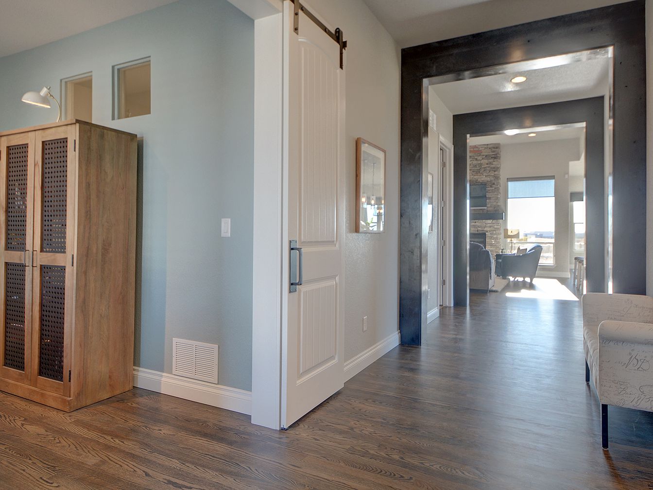 A spacious entryway featuring a blend of modern and rustic aesthetics. The walls are painted a soft light blue, enhancing the open feel. A wooden cabinet with decorative mesh doors stands adjacent to a white panel door, offering stylish storage. The hardwood floor in warm tones extends down the hallway, drawing the eye toward a cozy living area visible in the distance. Natural light streams through large windows, illuminating the space. Architectural details include sleek trim and minimalist designs, while a polished, dark frame outlines the doorway, creating a contemporary contrast to the warm wood elements.