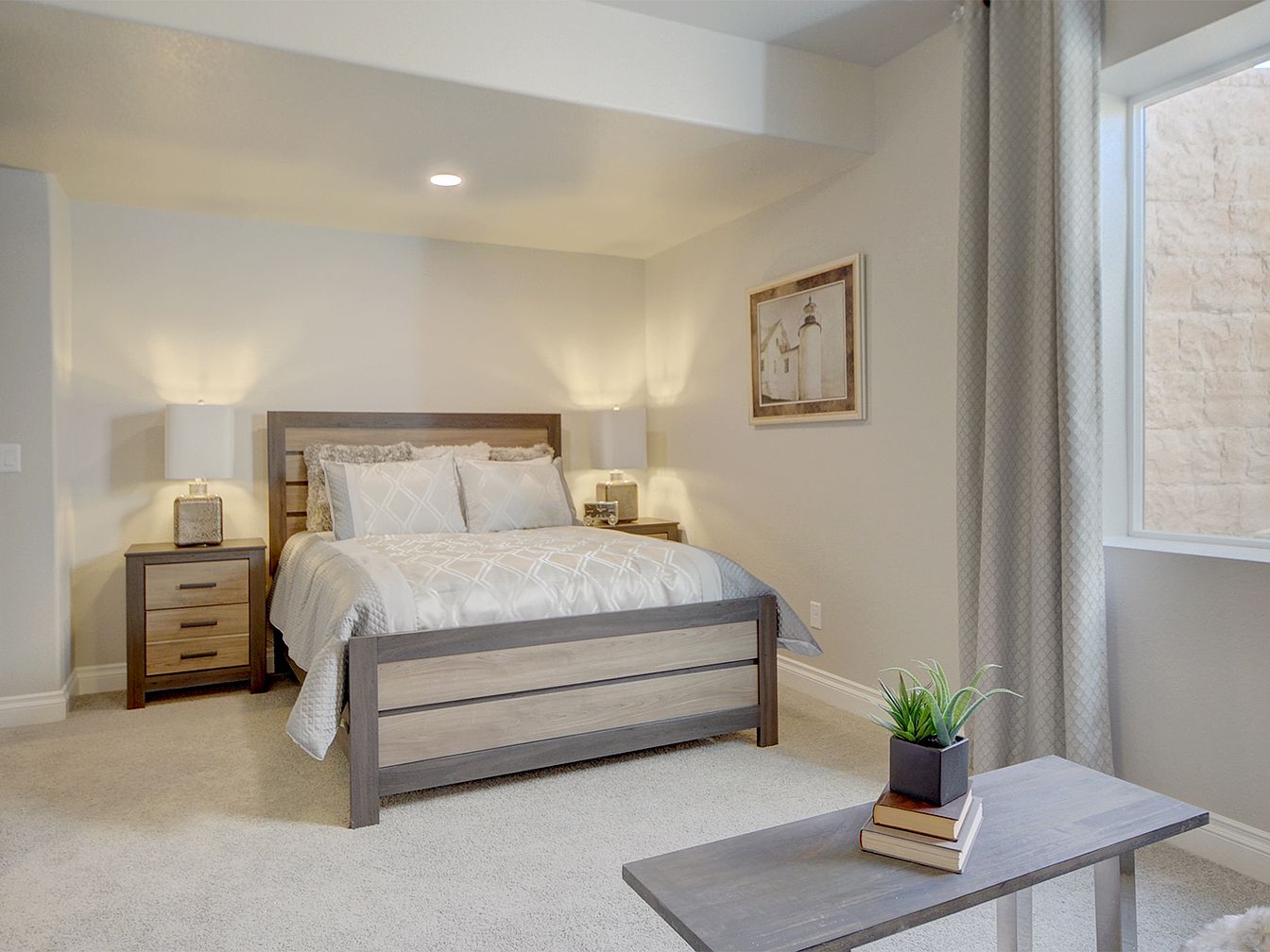 This serene bedroom features a cozy layout, centered around a beautifully crafted wooden bed with a neutral-toned quilt and decorative pillows. Flanking the bed are matching nightstands with elegant lamps, casting a warm glow. A minimalist coffee table, adorned with a small potted plant and stacked books, adds a touch of charm. The walls are painted in soothing light tones, enhancing the tranquil atmosphere. Textured gray curtains frame a bright window, inviting natural light and complementing the soft, plush carpet underfoot. A framed artwork depicting a lighthouse adds a personal touch to this inviting space.