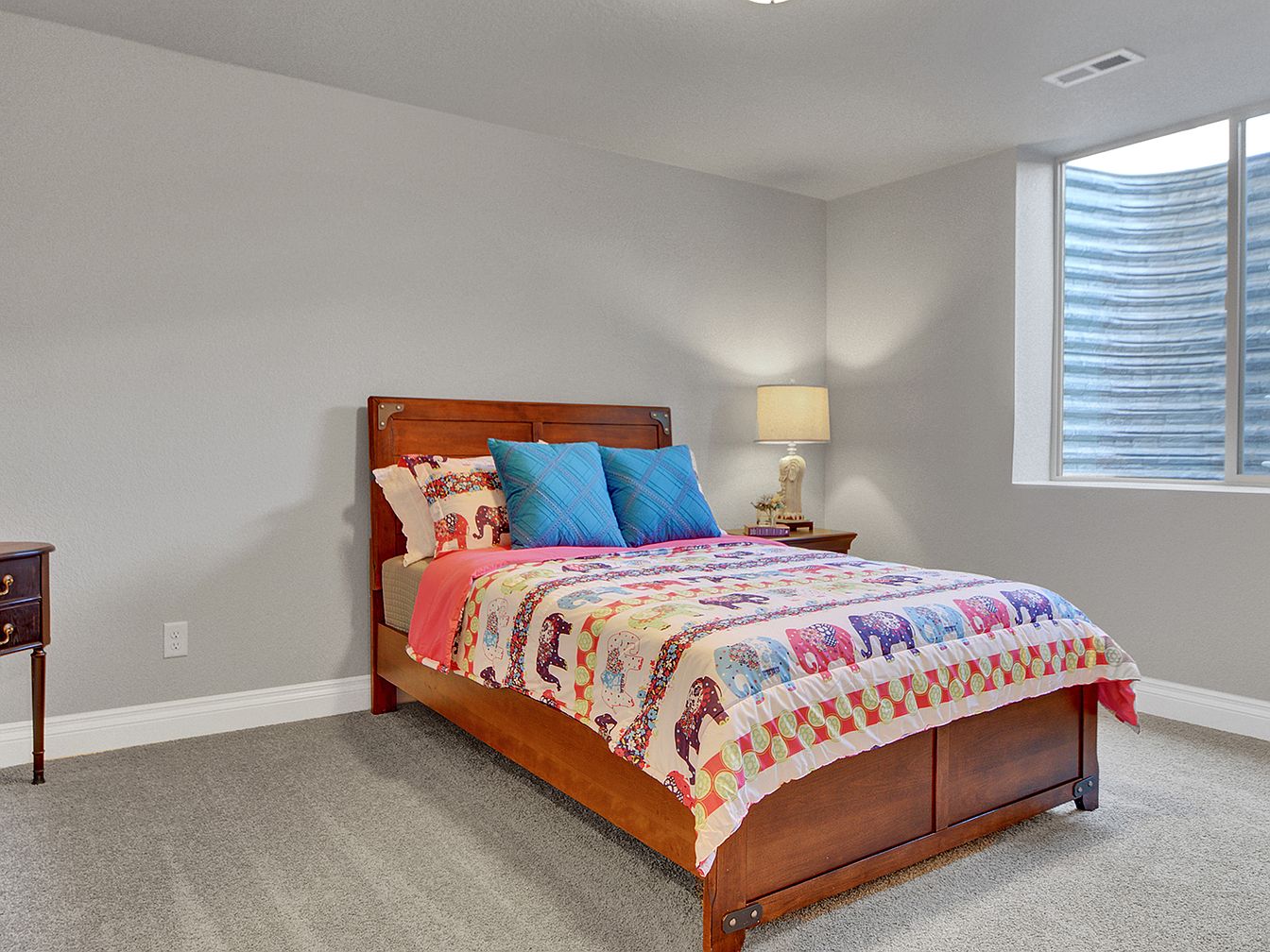 This cozy bedroom features a wooden bed frame positioned against a soft gray wall. The bedding is vibrant, showcasing a playful elephant motif in shades of pink and blue, complemented by two colorful throw pillows. A matching nightstand beside the bed holds a classic lamp, casting a warm glow. The flooring is carpeted in a light hue, enhancing the room’s inviting feel. Natural light streams through a large, uniquely shaped window, illuminating the space. Architectural details include crown molding and a simple ceiling light, contributing to the room’s modern yet comfortable ambiance.