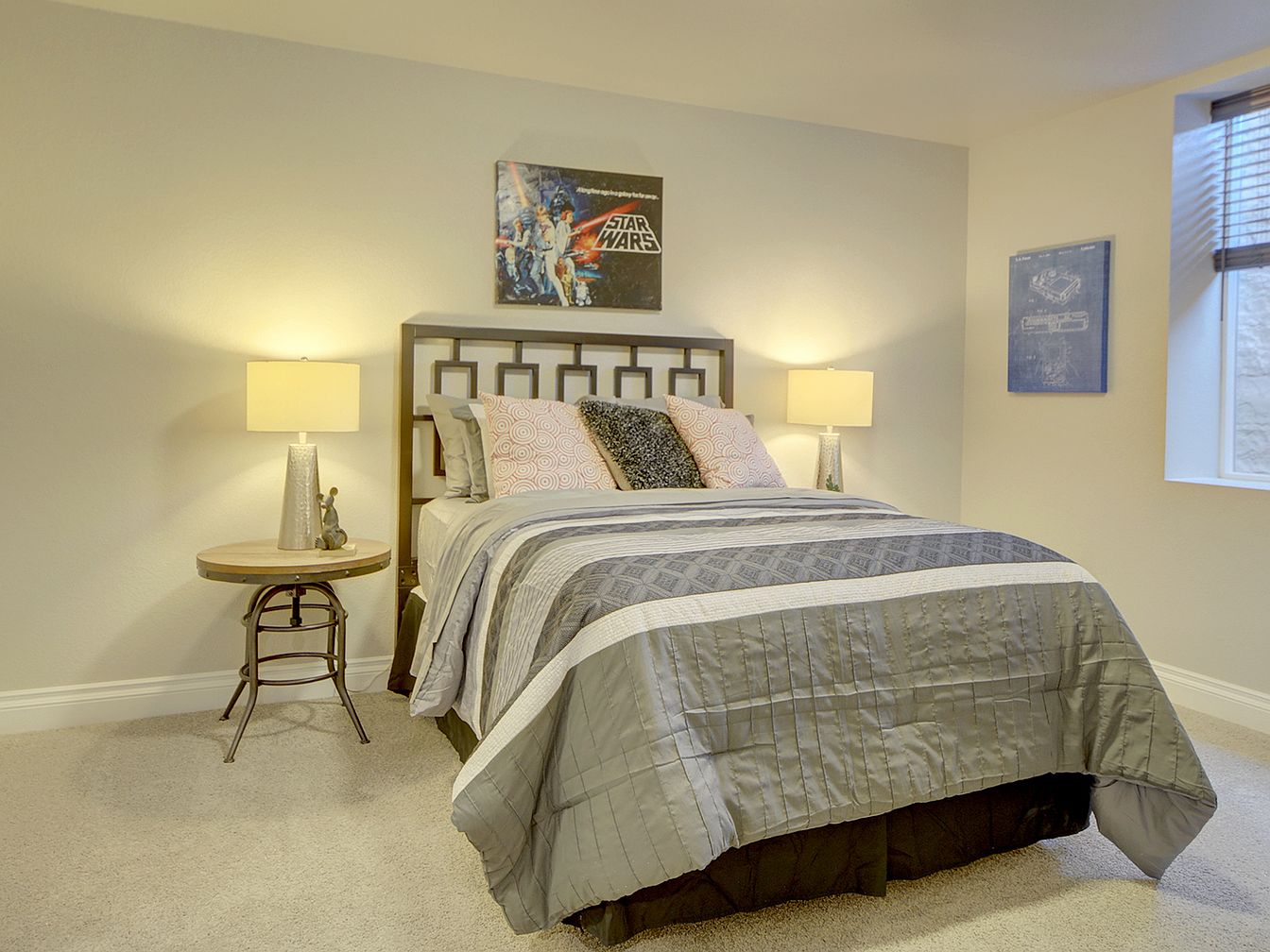 A cozy bedroom with a tranquil atmosphere. A neatly made bed with gray and patterned bedding occupies the center, complemented by decorative pillows featuring geometric designs. On one side, a sleek wooden nightstand with a circular top is accentuated by a modern lamp casting soft light. A small decorative figure rests on the nightstand. The walls are painted a soft beige, enhancing the calm ambiance. A vibrant Star Wars poster adds a playful touch above the headboard. A window with blinds allows natural light, while the plush carpet underfoot contributes warmth and comfort to the space.