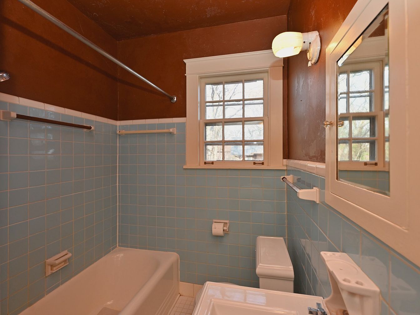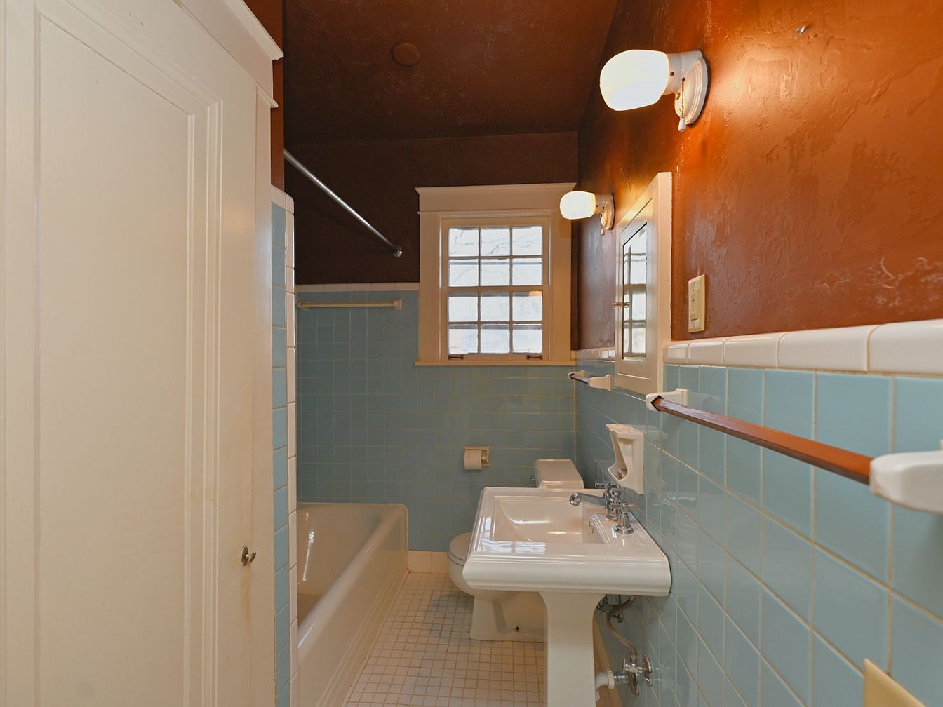 This bathroom features a vintage aesthetic with a unique blend of colors. The walls are painted a deep brown, contrasting with the light blue tiled backsplash that envelops the bathtub and sink area. A white rectangular sink, coupled with chrome fixtures, anchors the space. The bathtub, also white, is neatly positioned against the blue tiles. Natural light filters through the small window, enhancing the overall warmth. Simple wooden accents, including a light brown towel rail, introduce an inviting element. Frosted globe light fixtures provide illumination against the textured ceiling, creating a cozy and functional atmosphere.