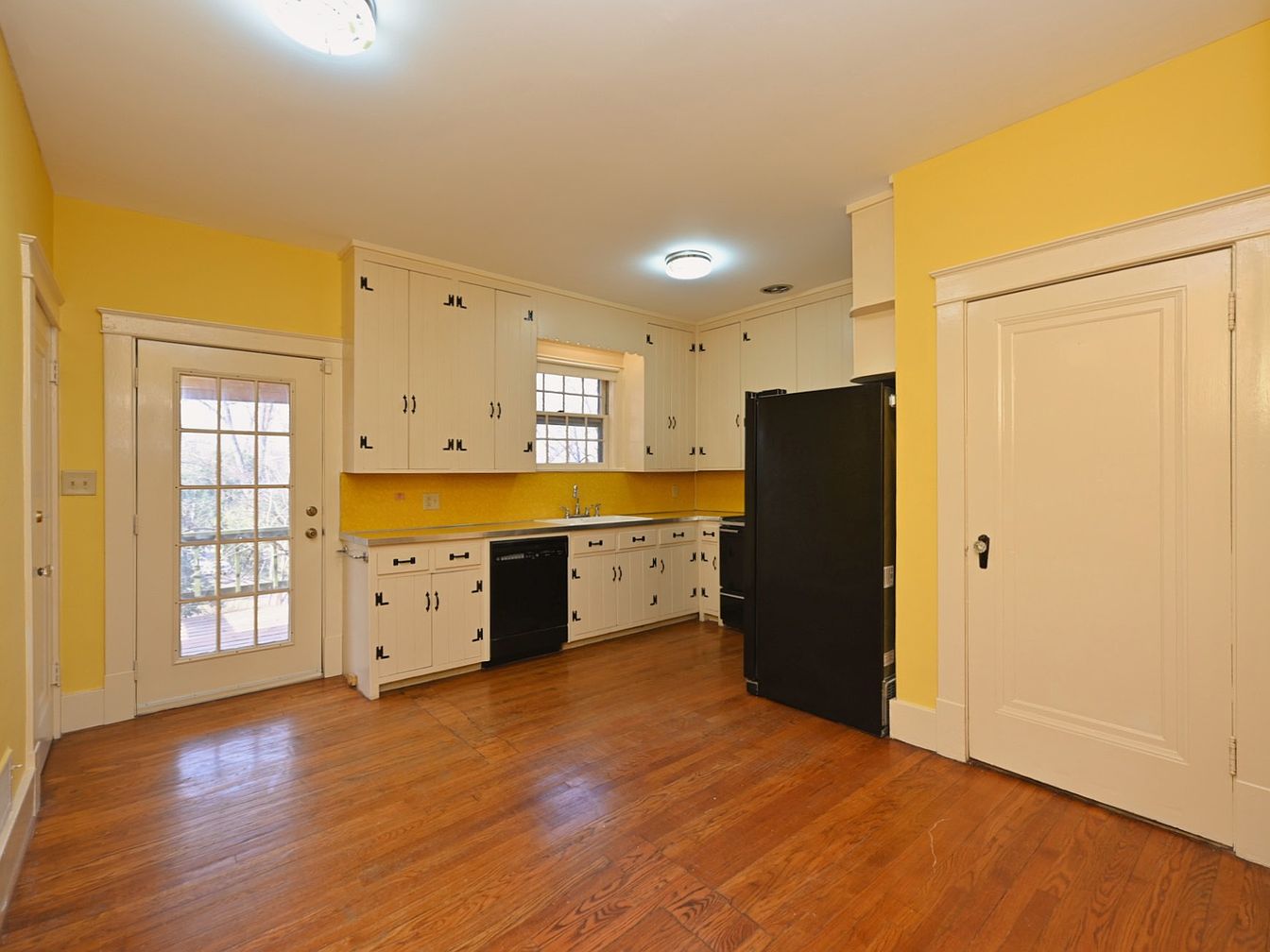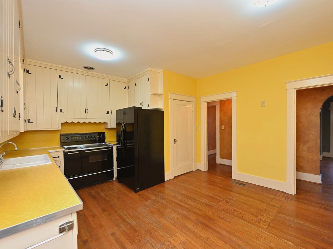 This kitchen features a cheerful yellow color scheme that brightens the space. The cabinetry, painted in a soft cream, provides ample storage and contrasts with the vibrant walls. A sleek black refrigerator and oven add a modern touch, while the vintage-style sink retains classic charm. The countertop showcases a textured yellow surface that complements the cabinetry. Rich wood flooring warms the room, with its grain visible in the wide boards. Doorways lead to adjoining spaces, created with simple white trim that contrasts with the walls, enhancing the kitchen’s inviting and functional appearance.