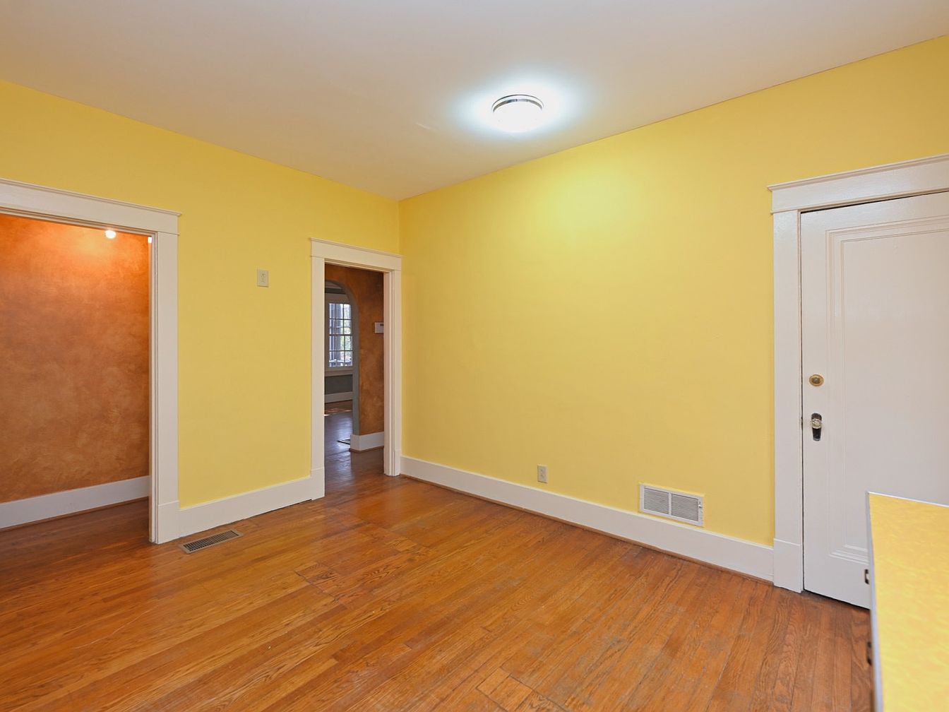 The entryway features warm yellow walls that create a bright, inviting atmosphere. To the left, a doorway leads to a room with a soft, earthy-toned wall, contrasting the vibrant yellow. The flooring is polished hardwood, enhancing the cozy feel of the space. White trim around the doors and windows adds a classic touch, while a contemporary ceiling light provides ample illumination. The door on the right is solid white, blending seamlessly with the wall, while vents in the baseboard suggest a heating system. Overall, the design strikes a balance between cheerful brightness and a sense of historical charm.