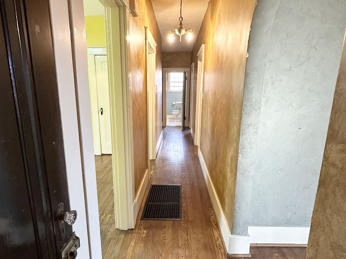 This historic hallway features a warm color palette with textured walls in golden hues, complemented by contrasting soft blue accents on one side. Dark wood flooring runs the length, enhancing the classic feel, while a simple yet elegant chandelier provides ambient lighting. The layout is linear, leading toward the background where a glimpse of an open door and bathroom can be seen, suggesting a functional space. White trim accents the doorways, enhancing architectural details, while a textured mat lies underfoot, emphasizing practicality. Overall, the design harmonizes warmth and historical charm, inviting exploration throughout the home.