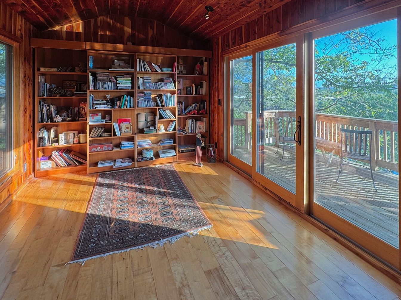 This cozy reading nook features rich wooden paneling, creating a warm and inviting atmosphere. A large, custom-built bookshelf occupies one wall, filled with an eclectic mix of books and personal items. Sunlight pours in through expansive sliding glass doors, illuminating the space and offering a stunning view of the deck outside. The polished hardwood floor adds a glossy finish, complemented by a patterned area rug that introduces texture and color. Minimalist furniture, including a simple chair positioned to enjoy the view, enhances the serene ambiance. Overall, this space encourages relaxation and contemplation.