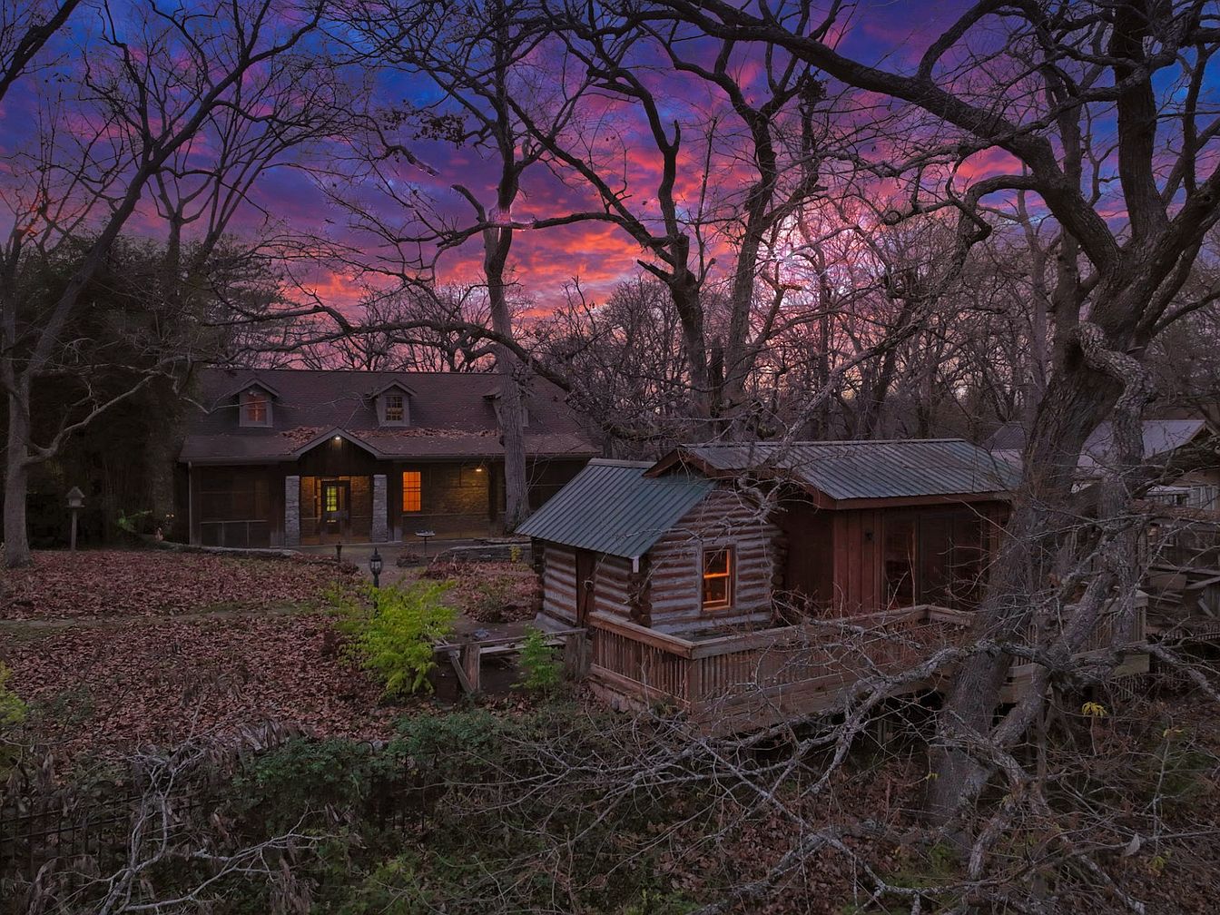 The image captures the exterior of a historic American home and a charming log cabin, both framed by bare trees under a vibrant, multicolored sunset sky. The main house features a traditional sloped roof with gabled dormers, while its stone and wood elements convey a rustic elegance. Warm yellow lights glow from the windows, inviting warmth into the scene. The log cabin complements the aesthetic with its wooden structure and porch, offering a cozy retreat. The surrounding landscape is adorned with fallen leaves, enhancing the autumn atmosphere, while hints of greenery peek through the natural decay.