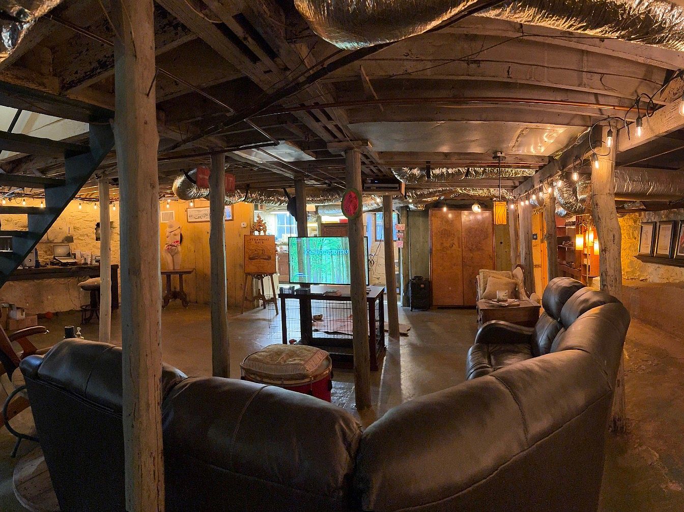 This basement lounge features an open layout illuminated by warm, hanging bulbs, creating an inviting ambiance. The flooring is a simple concrete, while exposed wooden beams and rustic wooden columns emphasize the space’s historic charm. A large, dark leather sectional couch complements a coffee table, enhancing comfort. To the side, an antique wooden wardrobe stands prominently, flanked by decor items that reflect a blend of modern and vintage styles. Ambient lighting along the ceiling and walls, paired with vibrant yellow wood paneling, adds character, making it a cozy retreat suitable for relaxation or social gatherings.