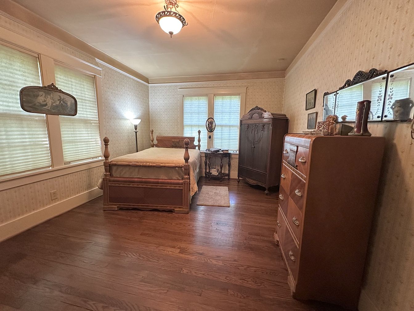 This historic bedroom features a traditional design with a warm wood floor and charming wallpaper. The walls are adorned with a soft, floral pattern in muted tones, complementing the natural light filtering through the closed blinds. A vintage wooden bed sits at the center, dressed in a subtle, patterned coverlet. To one side, an antique dresser showcases intricate hardware, while a matching wardrobe adds character. A round accent table holds a delicate mirror and decor, enhancing the room’s nostalgic feel. A ceiling fixture casts an inviting glow, creating a cozy and tranquil atmosphere, perfect for rest.
