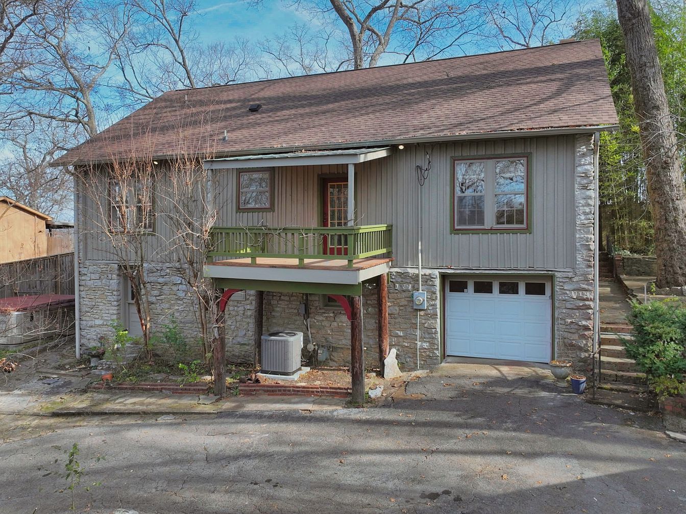 The image captures the exterior of a historic American home, showcasing a multi-level structure with a stone base and wooden upper levels. The house features a warm, earthy color palette of muted browns and greens. A covered balcony extends from the second floor, highlighted by vibrant green railings. Below, a paved driveway leads to a garage, bordered by moss and greenery, enhancing the rustic charm. Tall, bare trees frame the property, adding to its natural appeal. Architectural details include large windows with decorative trims, and the overall layout suggests a comfortable, welcoming home environment.