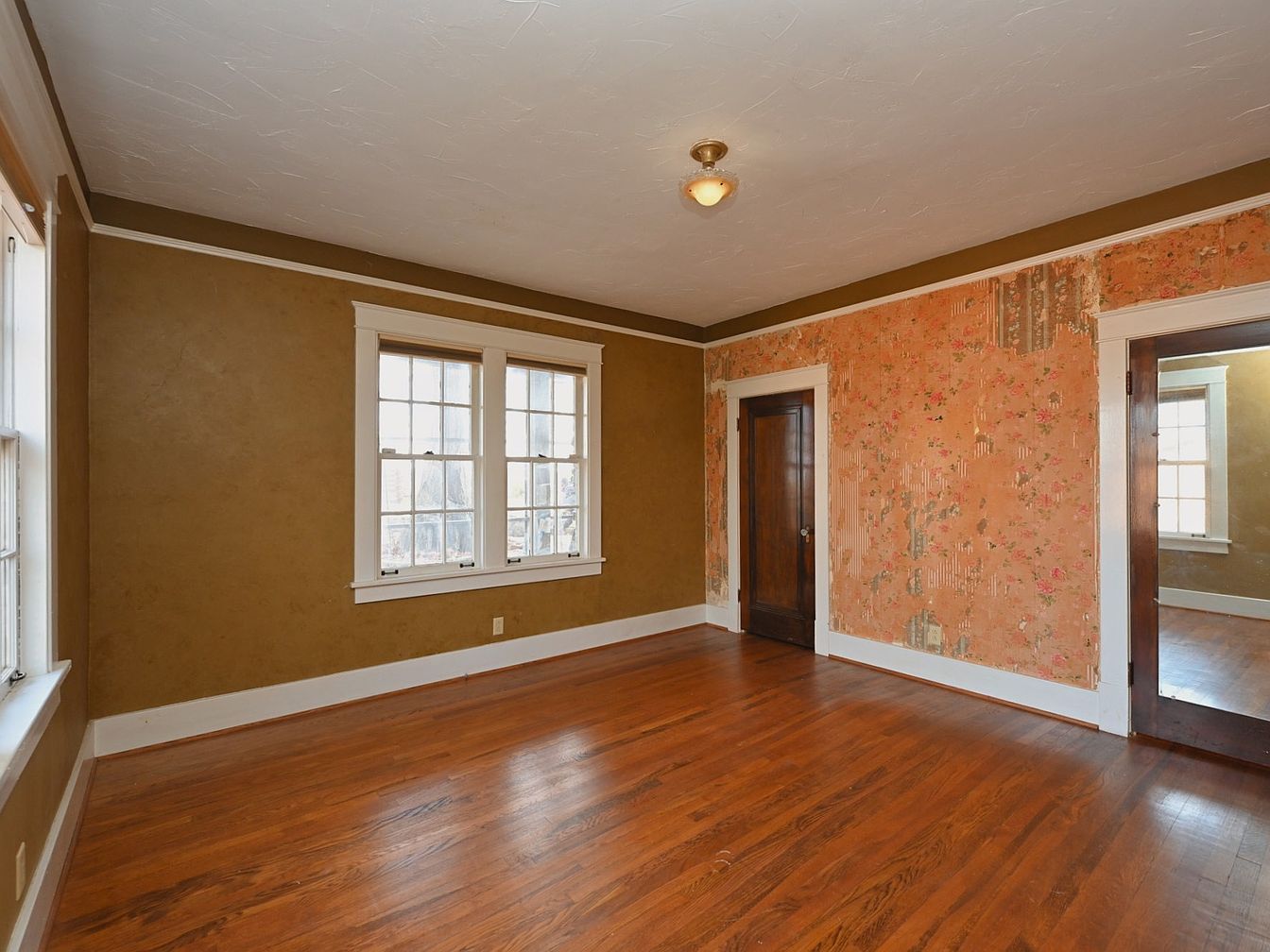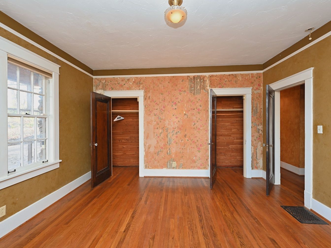 This bedroom highlights a blend of historical charm and natural lighting. Features include multiple entrances, facilitating easy movement. The walls are adorned with warm, earthy tones, complemented by an accent wall showcasing vintage floral wallpaper that adds character. Original hardwood flooring stretches across the space, reflecting a rich brown hue that enhances the warm ambiance. Light fixtures hang from the ceiling, providing illumination. Built-in closets with dark wood doors provide storage solutions while maintaining the room’s aesthetic. Large windows invite natural light, creating an inviting atmosphere that enhances the cozy, lived-in feel of the room.