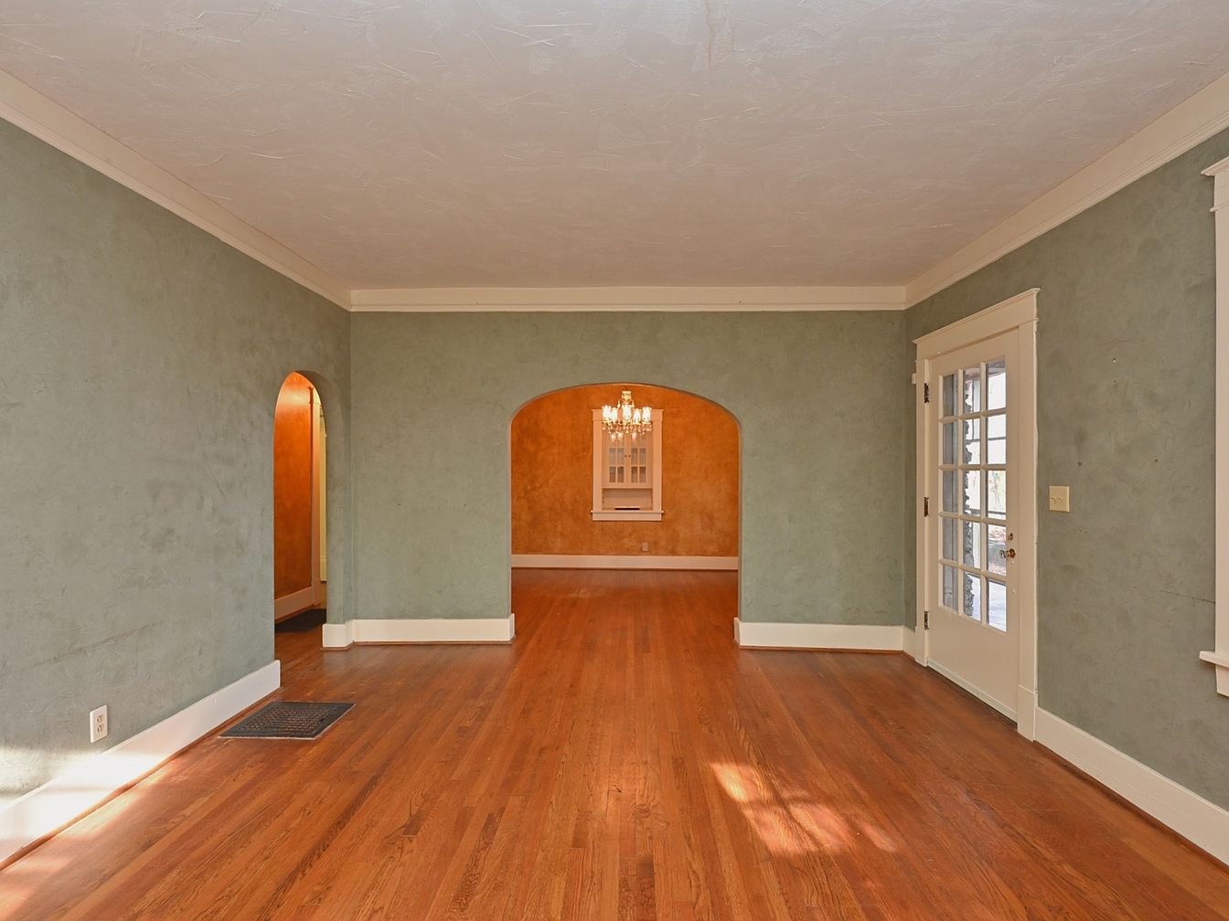 A spacious living room characterized by its warm color palette and unique architectural features. The walls are adorned with a soft green texture, creating a calm atmosphere, while two archways lead to adjoining spaces. Rich wooden floors enhance the rustic charm, contrasting beautifully with the walls. A striking chandelier hangs gracefully in the archway, providing subtle illumination that draws attention. The overall layout promotes an open feel, with natural light flowing in through the French doors on one side. This inviting area is perfect for gatherings, showcasing both historical character and modern comfort.
