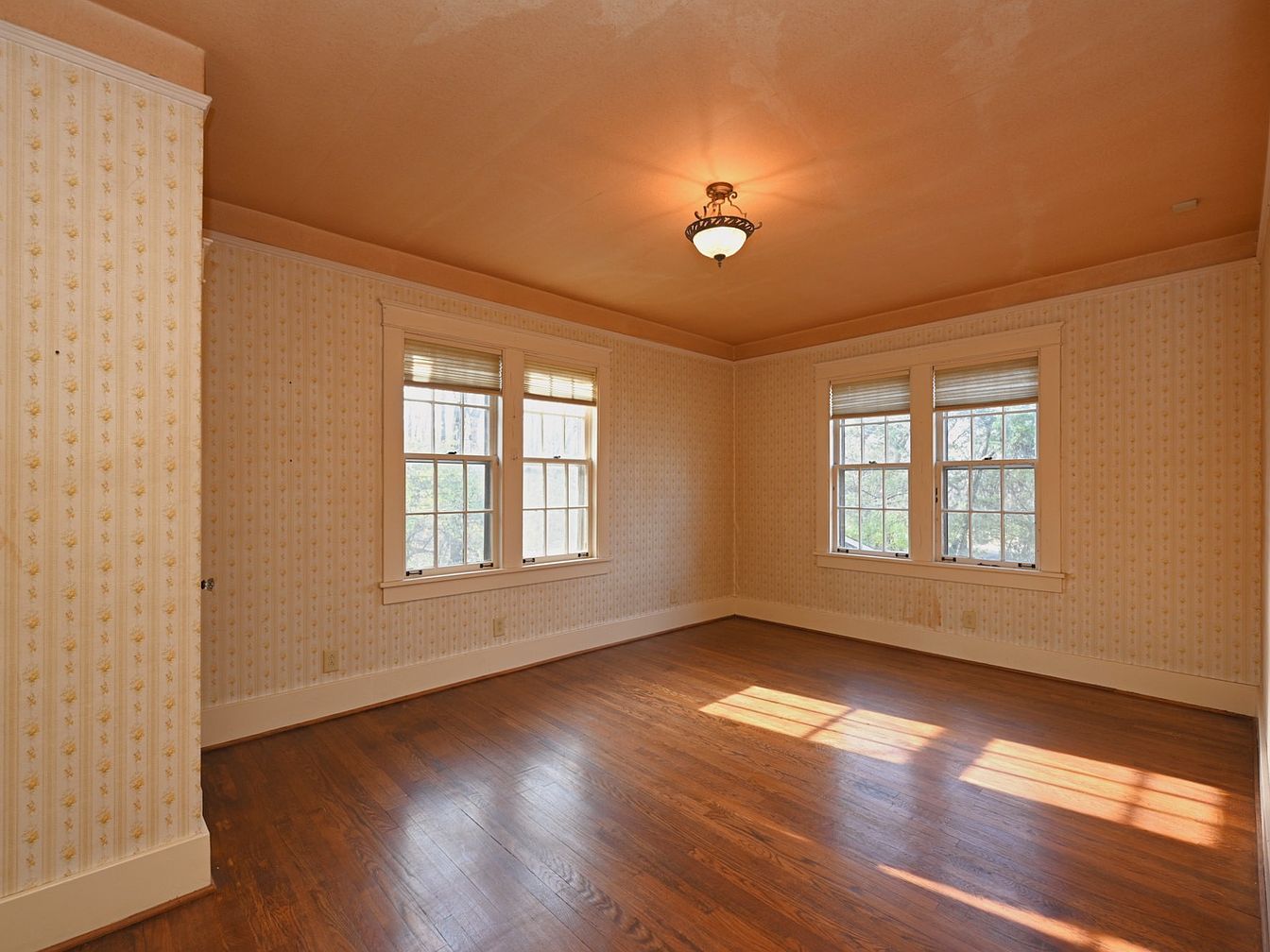 A cozy bedroom features light, warm peach walls with classic floral wallpaper, radiating a vintage charm. Two large windows allow natural light to flood the space, accentuating the wooden floor’s rich tones. The architectural details include white trim around the windows and a delicate ceiling light fixture, adding elegance. The flooring is polished hardwood, providing a natural aesthetic that complements the light-colored walls. The overall atmosphere is serene and inviting, ideal for relaxation. A subtle hint of nostalgia is present, reflecting the historical essence of the home, with ample room for personal touches and decor.