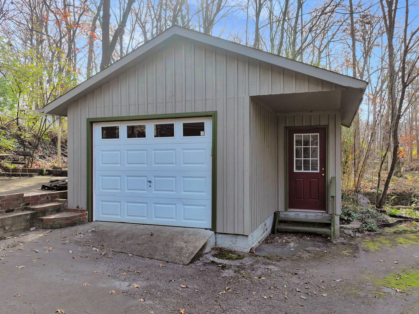 The image shows a broad, contemporary garage with a large, pale blue overhead door, featuring geometric paneling. Adjacent to it is a smaller entrance door framed in dark green, which complements the garage’s siding. The exterior features vertical wood paneling in a muted beige, harmonizing with the natural surroundings. A concrete driveway leads up gently to the garage, flanked by steps constructed from red bricks, adding a rustic touch. Behind the structure, a wooded area hints at a tranquil, rural setting. The scene is vibrant with autumn foliage, enhancing the connection between the home and nature.