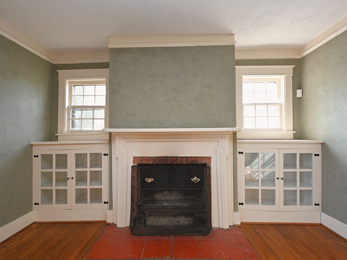 This living room features a cozy corner fireplace framed by elegant white cabinetry with glass doors, ideal for displaying collectibles. The soft green walls create a serene atmosphere, complemented by natural light filtering through the double-hung windows. The room has a rich wood floor, adding warmth and contrast to the lighter tones. Architectural details include subtle crown moldings along the ceiling and a mantel that enhances the fireplace’s charm. The combination of colors and textures fosters a welcoming and intimate space, perfect for gathering or quiet relaxation.