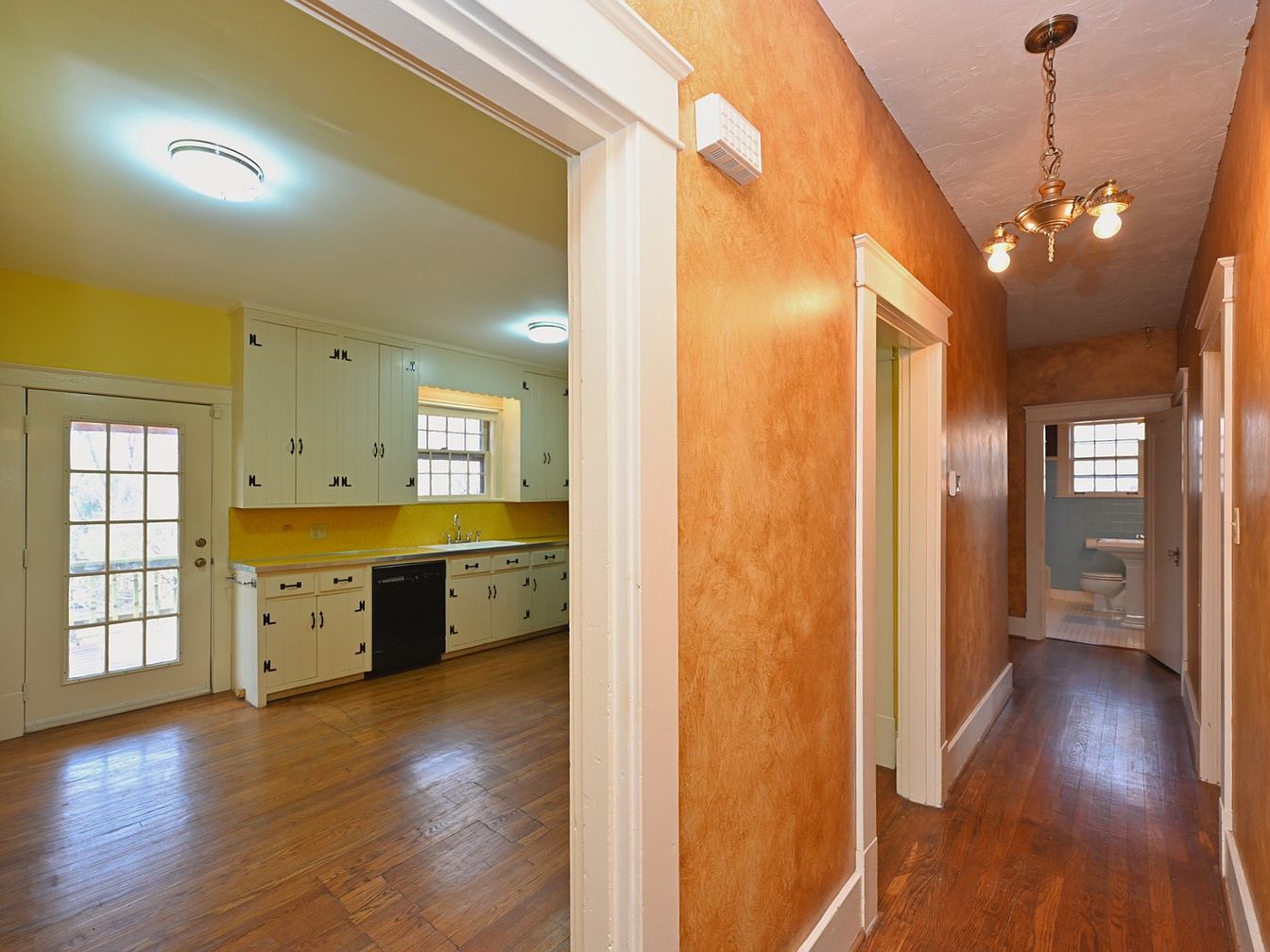 The space features a bright kitchen corridor that connects to a charming kitchen with a warm yellow color scheme and white cabinets adorned with black handles. Natural light filters through a grid-patterned window above the sink, illuminating the gleaming wooden floor. Opposite the kitchen, a hallway displays textured, warm-toned walls that add depth, complemented by a polished light fixture with three bulbs hanging from the ceiling. Two doorways lead to adjacent rooms, while a further glimpse reveals a bathroom through a frosted glass window, enhancing the inviting atmosphere of this well-designed home.