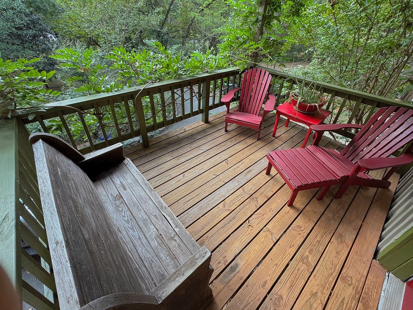 This outdoor deck features a warm, inviting atmosphere highlighted by rich wooden flooring, which contrasts beautifully with the natural surroundings. Two vibrant red Adirondack chairs pair with a small red table, creating a cozy conversation area. A rustic wooden bench adds charm and functionality. Lush greenery envelops the space, enhancing privacy and providing a serene backdrop. The overall color scheme combines earthy wood tones with bold red accents, creating a harmonious blend of comfort and style. Architectural details include the railing adorned with delicate vines, amplifying the deck’s connection to nature.