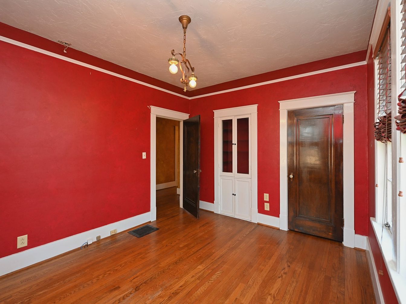 A cozy room featuring vibrant red walls that create a warm ambiance. The rich wood tones of the hardwood floor contrast beautifully with the bold wall color. A brass chandelier with three bulbs hangs from the ceiling, adding a vintage touch. On one side, a white built-in cabinet with glass doors offers storage while enhancing the room’s charm. Two doors, one leading to a hallway and another to the outside, are framed with white trim, harmonizing with the overall aesthetic. Natural light spills in through a window adorned with wooden blinds, accentuating the lively atmosphere.