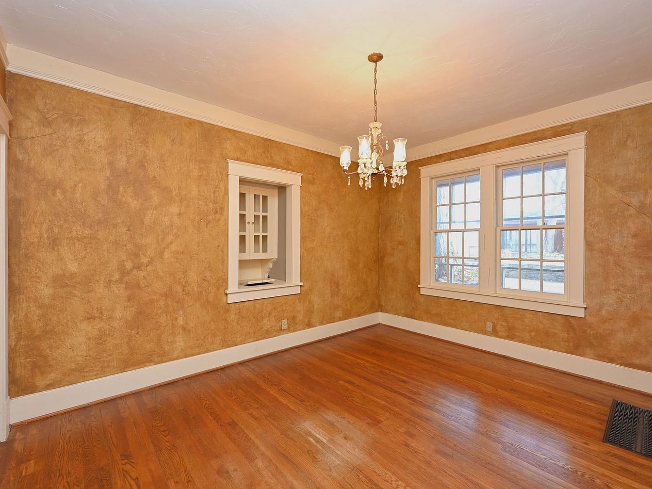 This dining room features warm, earthy tones with a textured, golden-brown wall that adds depth and character. A vintage chandelier hangs from the ceiling, casting a soft glow that enhances the room’s inviting ambiance. Natural light filters through large, double-hung windows, illuminating the polished hardwood floors that reflect the light beautifully. The architectural details include crisp white trim around the windows and baseboards, creating a striking contrast against the walls. An inset bookshelf offers practical storage while maintaining an aesthetic charm. Overall, the space is both cozy and elegant, perfect for gatherings.