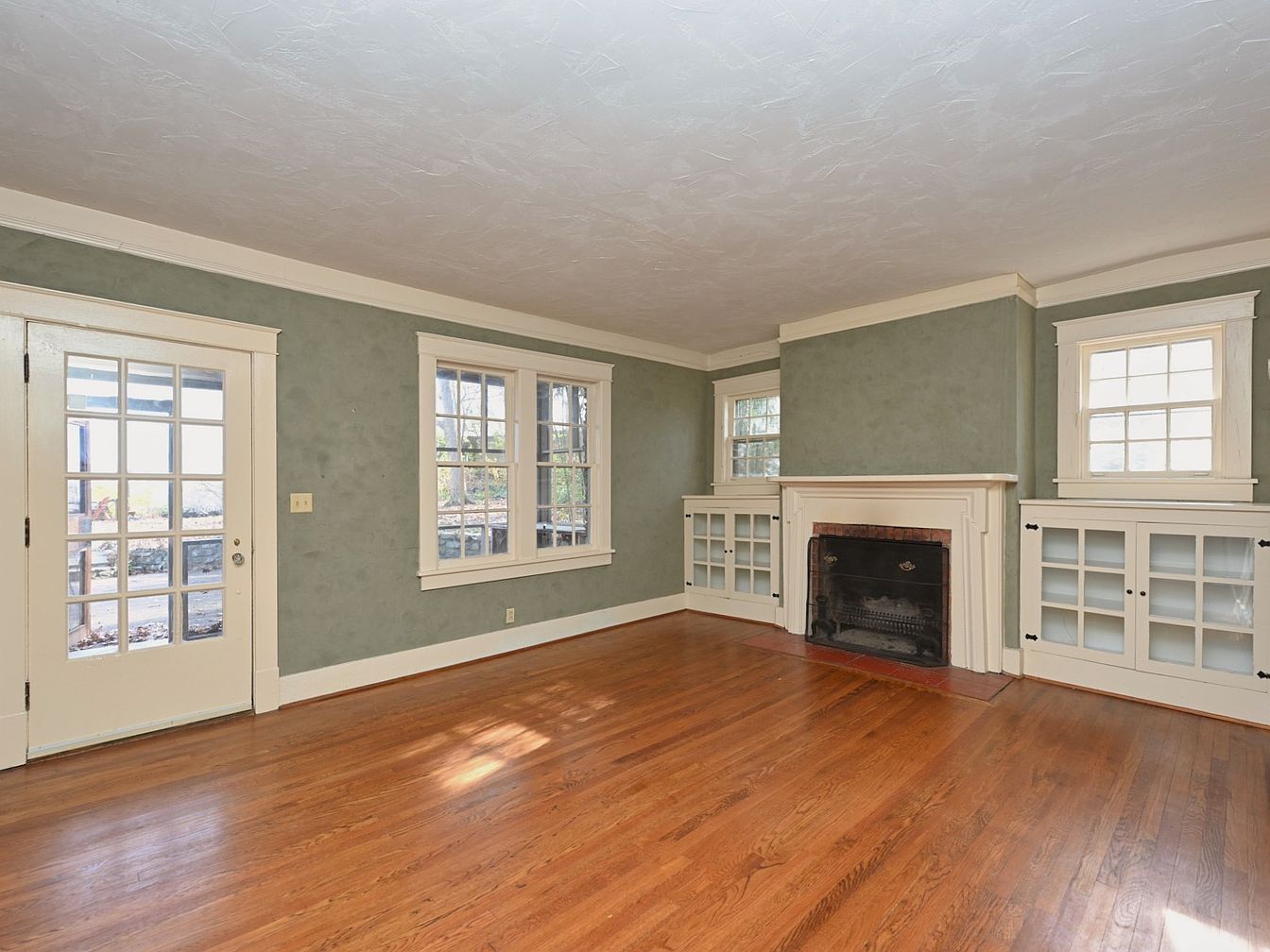 This spacious living room features a warm wooden floor complemented by a subtle green wall finish, creating a calm atmosphere. Large windows allow natural light to flood in, framed by classic white trim. A decorative fireplace with a brick base serves as a focal point, flanked by matching built-in cabinets that offer both functionality and charm. The room is connected to the outdoors via a glass-paneled door, enhancing the flow between indoor and outdoor spaces. Soft lighting from overhead illuminates the textured ceiling, contributing to a cozy yet elegant living ambiance.