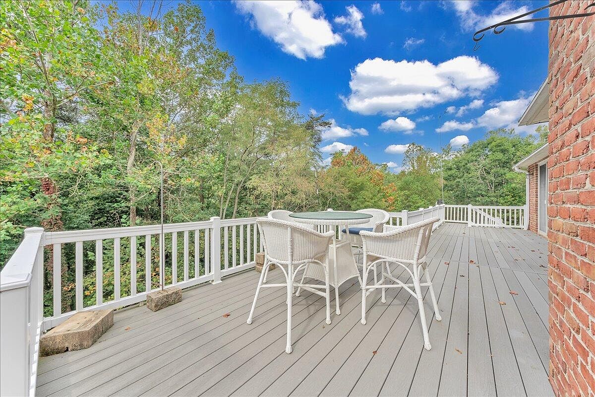 An inviting deck area features a wooden floor with a light gray hue, enhancing the spaciousness. A circular glass-top table is surrounded by four wicker chairs, offering a perfect setting for outdoor dining. The railing is white, contrasting beautifully with the rich browns of the natural wood and the brick wall visible to the right. Lush greenery surrounds the deck, with trees showing hints of autumn colors, creating a serene atmosphere. Above, a bright blue sky with fluffy clouds adds a cheerful backdrop. This space combines comfort with nature, ideal for relaxation and gatherings.