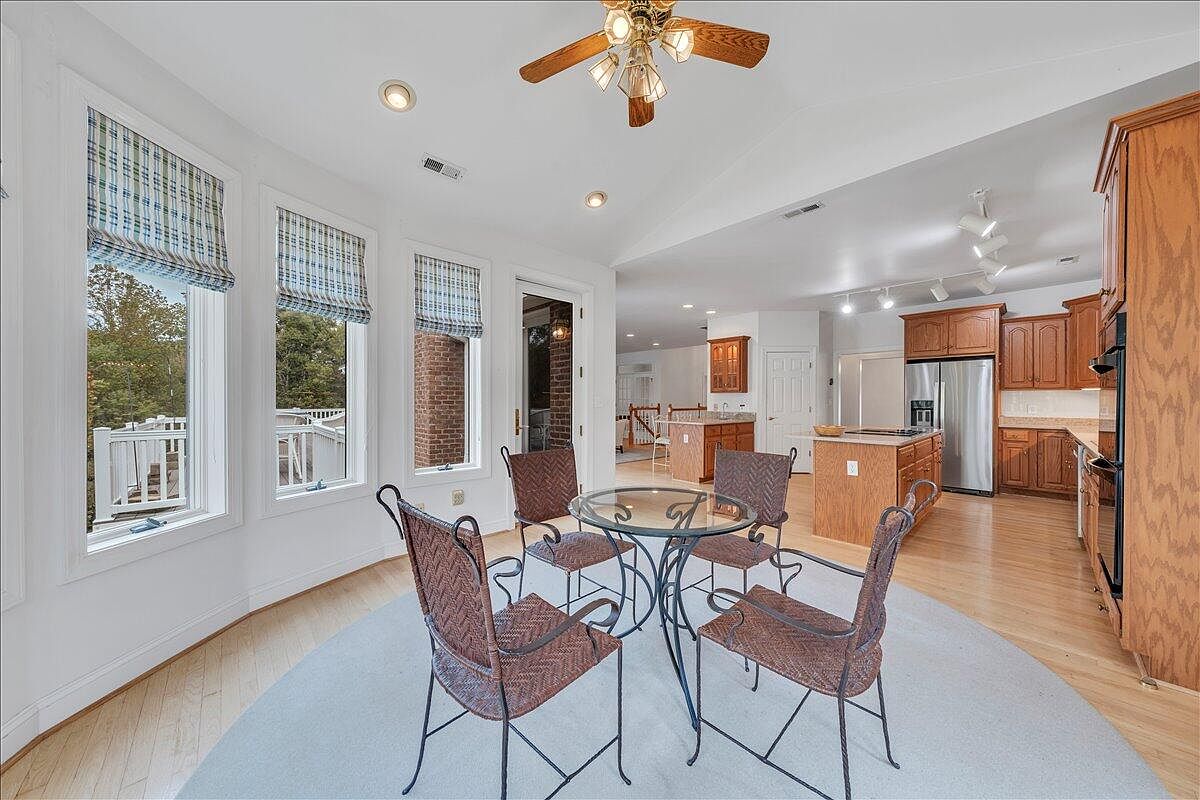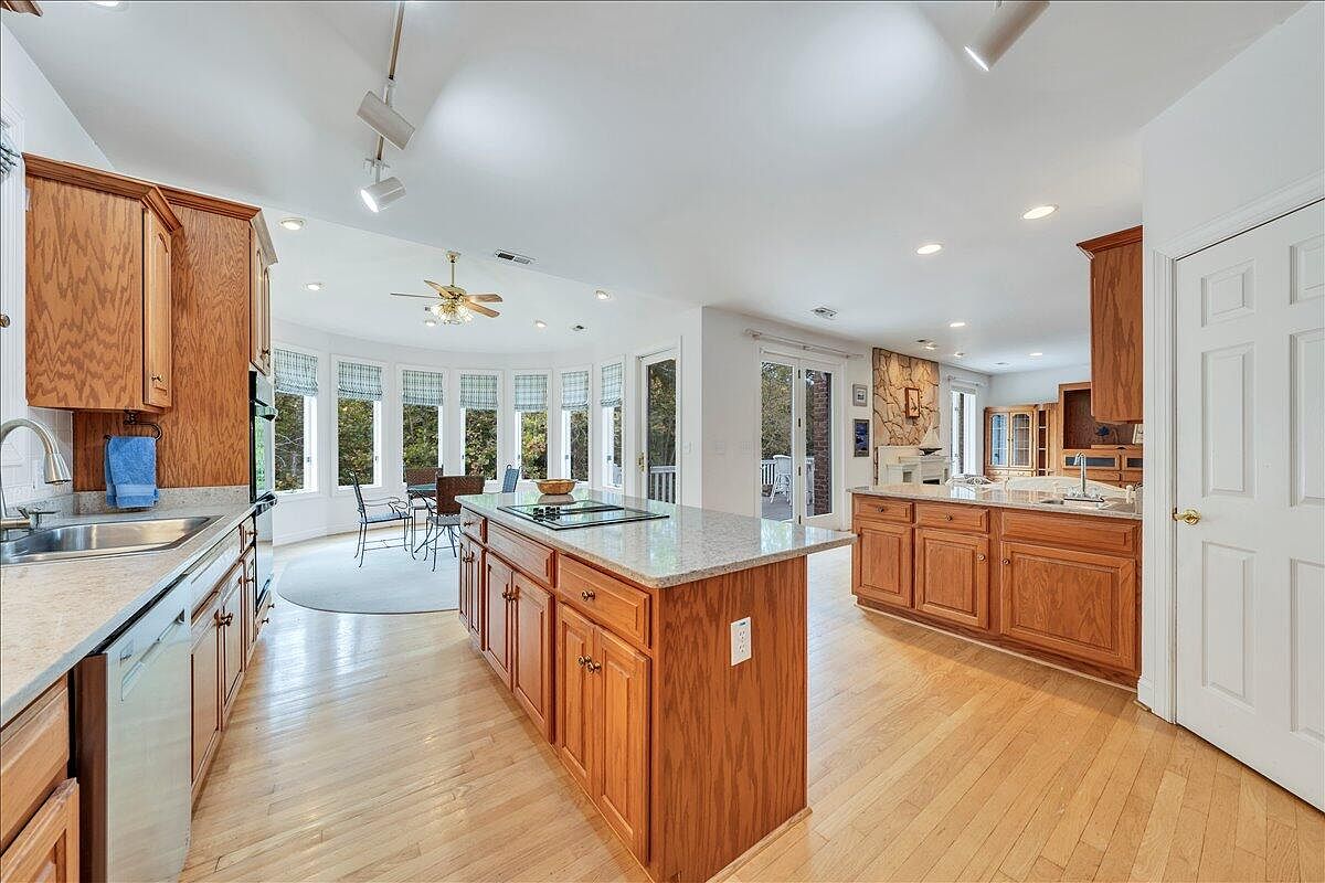 This spacious kitchen features a modern open layout with gleaming hardwood floors and an inviting light color palette. The wooden cabinetry exudes warmth, complemented by a contrasting granite countertop. A large kitchen island serves as a central workspace, equipped with a cooktop. Surrounding windows draped with checked fabric treatments flood the area with natural light. A cozy seating nook in the bay window is perfect for casual meals, while the transition to the adjacent dining area is seamless. Bright recessed lighting and a ceiling fan add functionality and comfort to this stylish culinary space.