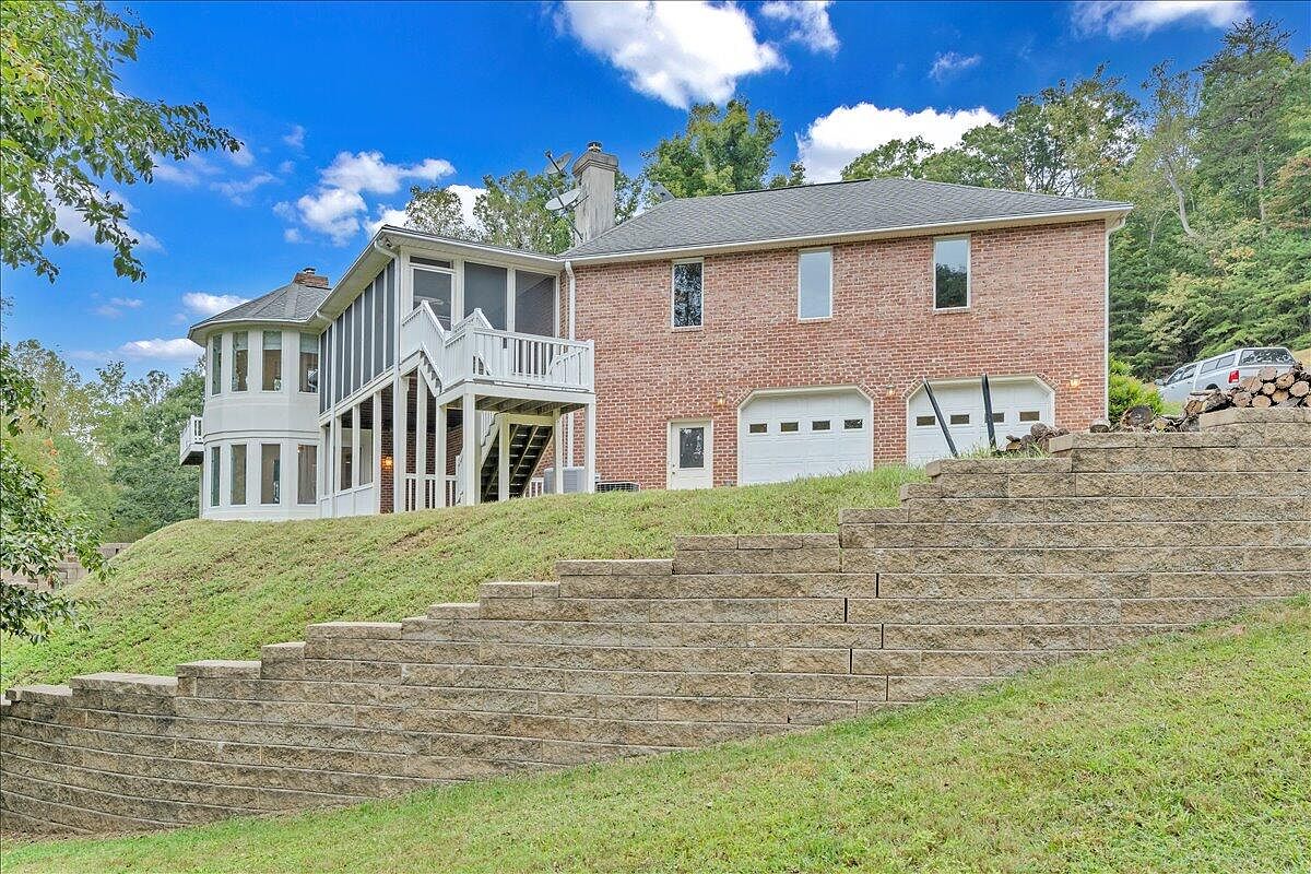 This image showcases the back of a historic American home, highlighting a multi-level design with a striking combination of brick and white detailing. The upper deck features a protective screen, framed by ample windows, allowing natural light to flood in while providing unobstructed views of the surroundings. A set of stone stairs leads gracefully from the sloped lawn to the lower patio, adding architectural interest. The vibrant greenery surrounding the property, coupled with a blue sky dotted with clouds, enhances the inviting atmosphere. Multiple outdoor spaces invite relaxation and social gatherings, embodying a seamless blend of nature and architecture.