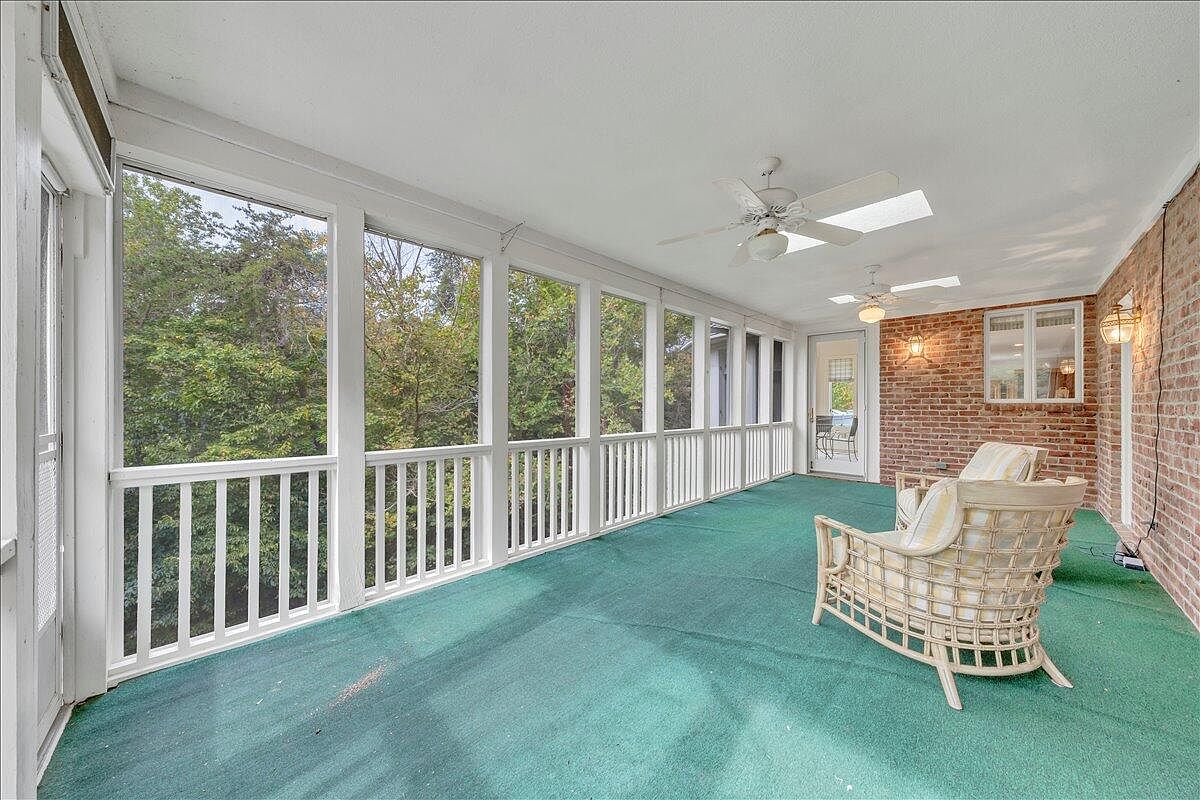 This spacious sunroom features a green carpet that complements the natural scenery visible through large windows. The room is framed with white, wooden railings, allowing light to flood in. A charming wicker chair with soft cushions invites relaxation, accentuated by delicate, vintage-style lanterns mounted on the brick wall. The textured red bricks add warmth and character to the space, seamlessly blending with the contemporary ceiling fans above, which provide comfort during warmer days. A doorway leads to the outside, enhancing the connection between indoor and outdoor living, perfect for enjoying peaceful moments surrounded by nature.