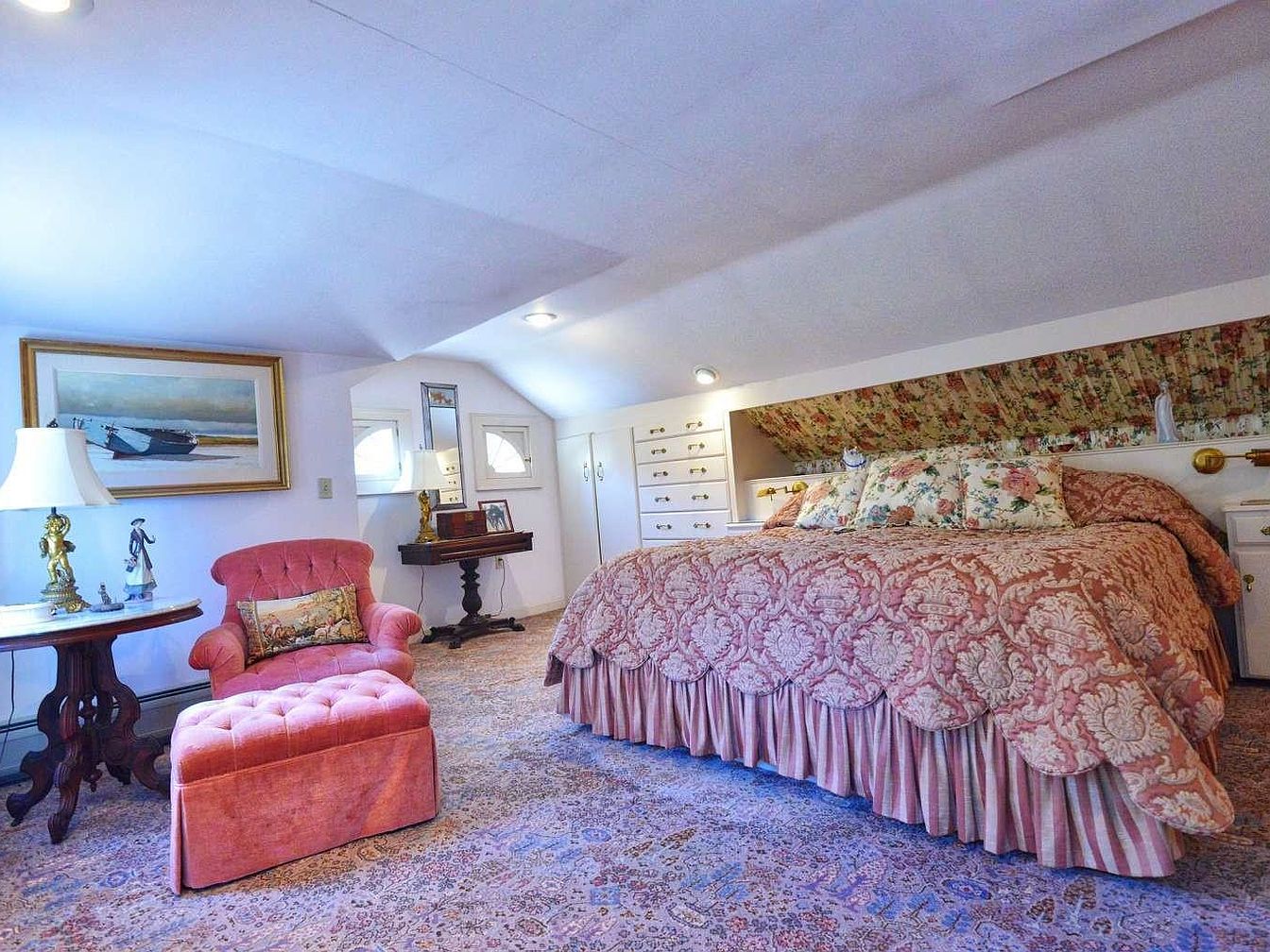 This cozy bedroom features a sloped ceiling enhancing its charm. The primary focal point is a large bed adorned with an intricate pink quilt and floral-patterned pillows, creating a soft, inviting atmosphere. A vintage pink chair with tufted upholstery complements the bed, while a small side table showcases artistic details. Light fixtures offer warm illumination, highlighting the delicate floral wallpaper and framed artwork on the walls. A colorful area rug adds warmth to the hardwood floor, and ample storage is provided by white cabinets with brass handles, maintaining an organized yet homey feel throughout the space.