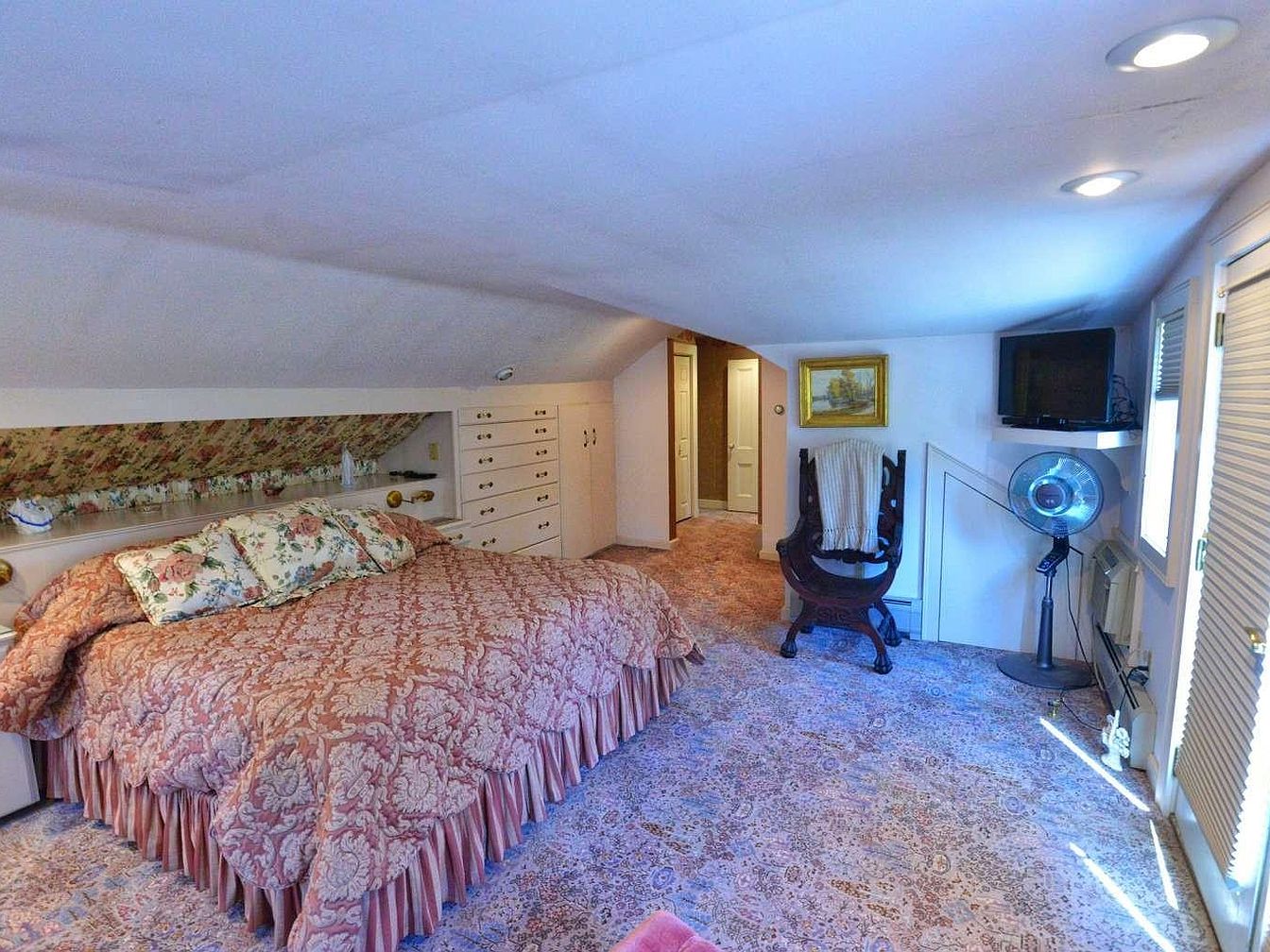 A cozy attic bedroom features sloped ceilings adorned with recessed lighting, enhancing the intimate atmosphere. The bed, centered and wrapped in a floral patchwork quilt, showcases a harmonious blend of pink and white hues. Opposite, built-in drawers with a floral motif emphasize practical design, while decorative accents like vases add charm. A classic wooden rocking chair sits invitingly beside a small fan and flat-screen TV, ensuring relaxation. The plush carpet, patterned with intricate designs, complements the room’s vintage aesthetic. Large windows allow natural light, brightening the space and highlighting the warm, inviting color palette.