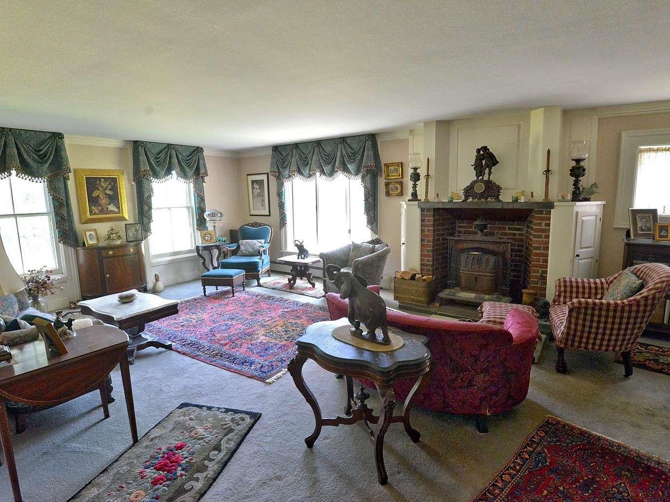 The space features a cozy living room with soft beige walls and plush carpet. Elegant drapes in deep teal frame large windows, allowing natural light to filter in. A red and blue Persian rug anchors the room, adding warmth and texture. Various seated areas consist of a vibrant pink velvet sofa, a classic checkered armchair, and a blue upholstered chair. A vintage fireplace with a brick surround serves as a central focal point, adorned with decorative artifacts and candles. Dark wooden end tables and accent pieces complement the overall aesthetic, creating a harmonious blend of traditional and inviting design.