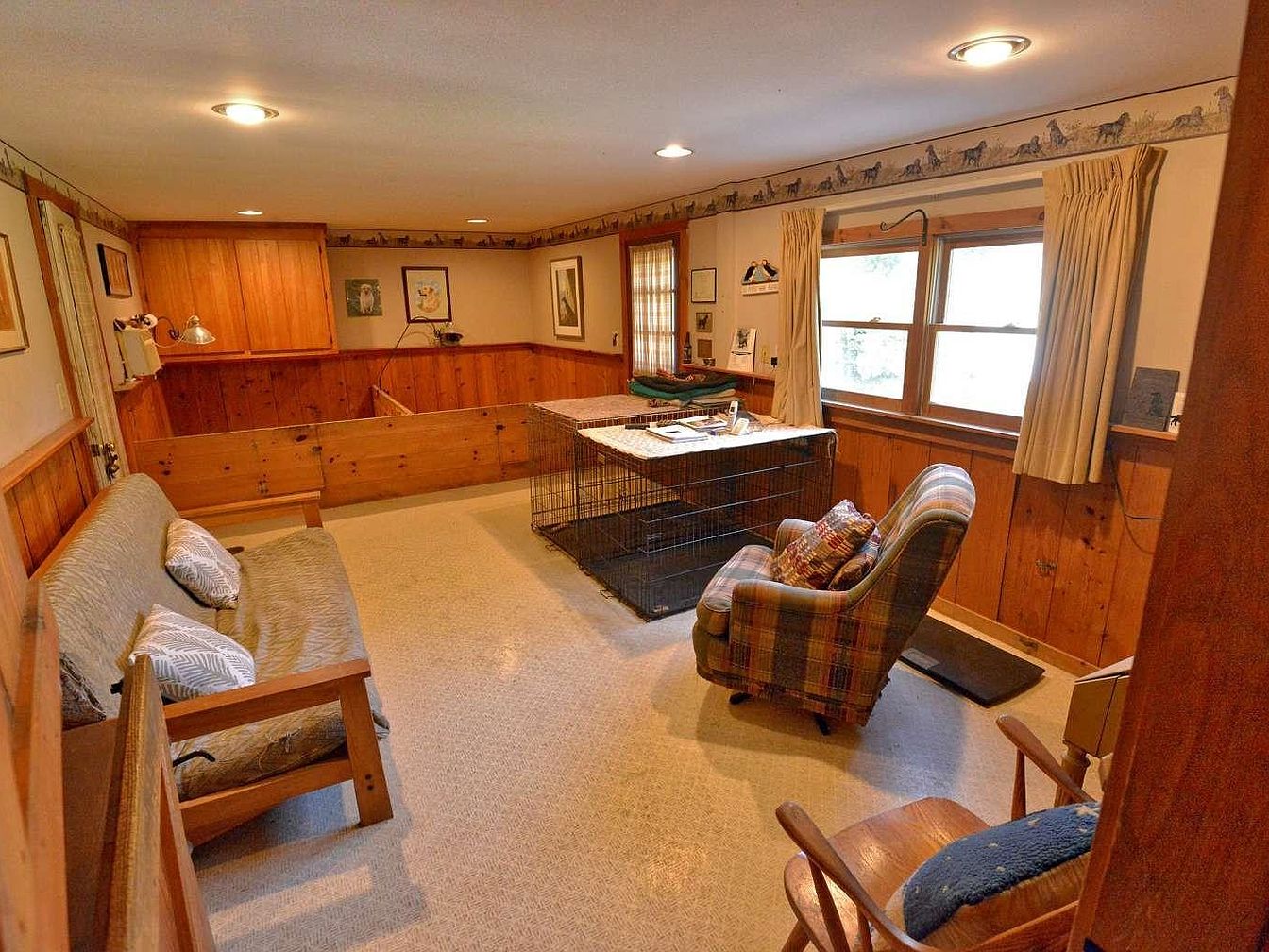 This cozy living room features warm wooden paneling, creating an inviting atmosphere. The layout includes a comfortable futon adorned with patterned cushions and a plaid armchair that complements the rustic aesthetic. Large windows adorned with light-colored curtains allow natural light to fill the room, enhancing the earthy tones. A wooden cabinet and framed art pieces on the walls add a touch of personality. The flooring is a soft beige carpet, providing comfort underfoot. A coffee table, set at the center, showcases a patterned tablecloth, with a pet enclosure nearby, demonstrating functionality alongside leisure.