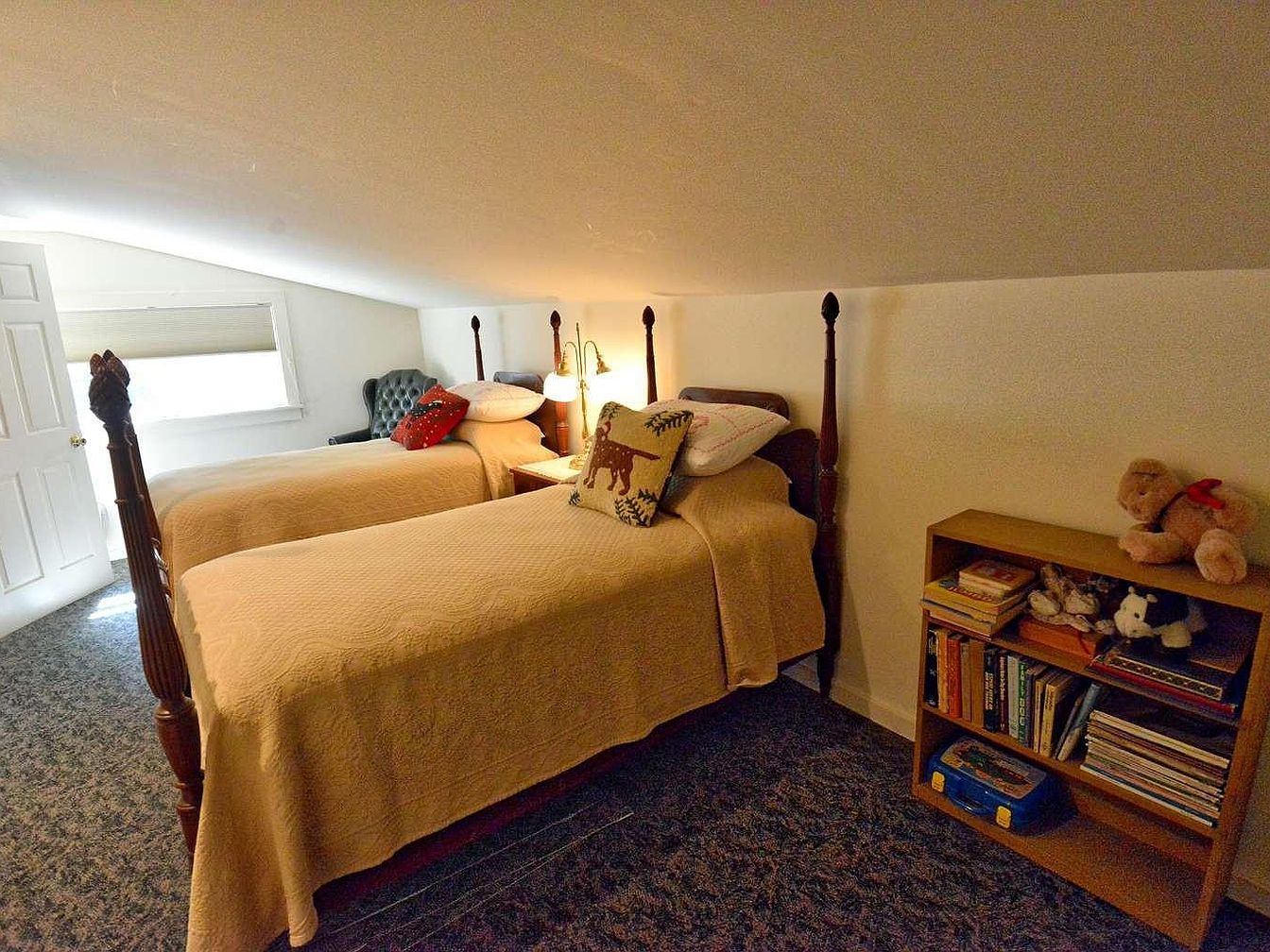 This cozy guest bedroom features two twin beds with dark wooden frames, each adorned with soft beige quilts and decorative pillows, one showcasing a charming deer design. The sloping ceiling adds a unique architectural appeal and is painted in a soft white, reflecting light throughout the space. A side table with a lamp offers warm illumination, perfect for reading. A plush, dark carpet underfoot complements the overall color palette. In the corner, an open bookshelf filled with children’s books and plush toys enhances the inviting atmosphere, suggesting a space designed for comfort and warmth.