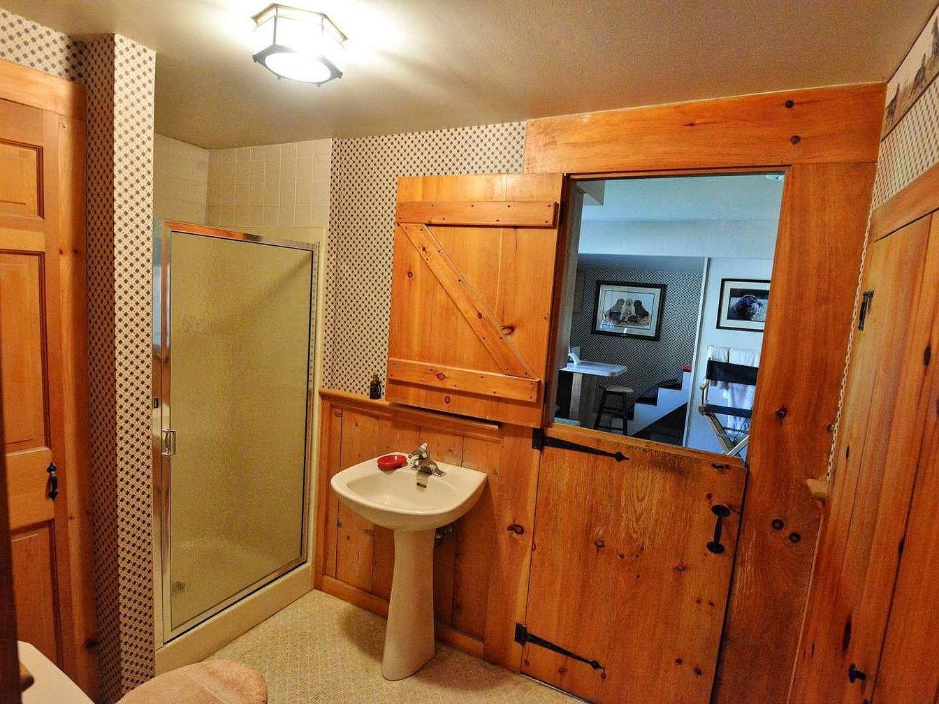 A cozy bathroom layout featuring warm wooden tones. The walls combine patterned wallpaper with natural wood paneling, creating a rustic charm. A sleek, frosted glass shower stall stands to one side, contrasting nicely with the wooden elements. A pedestal sink with a modern faucet is centered in front of a full-length mirror, providing functionality and style. The soft beige carpet adds warmth underfoot, while a unique barn door provides an interesting architectural touch, connecting to another space. The overall color palette is warm and inviting, blending traditional elements with contemporary convenience.