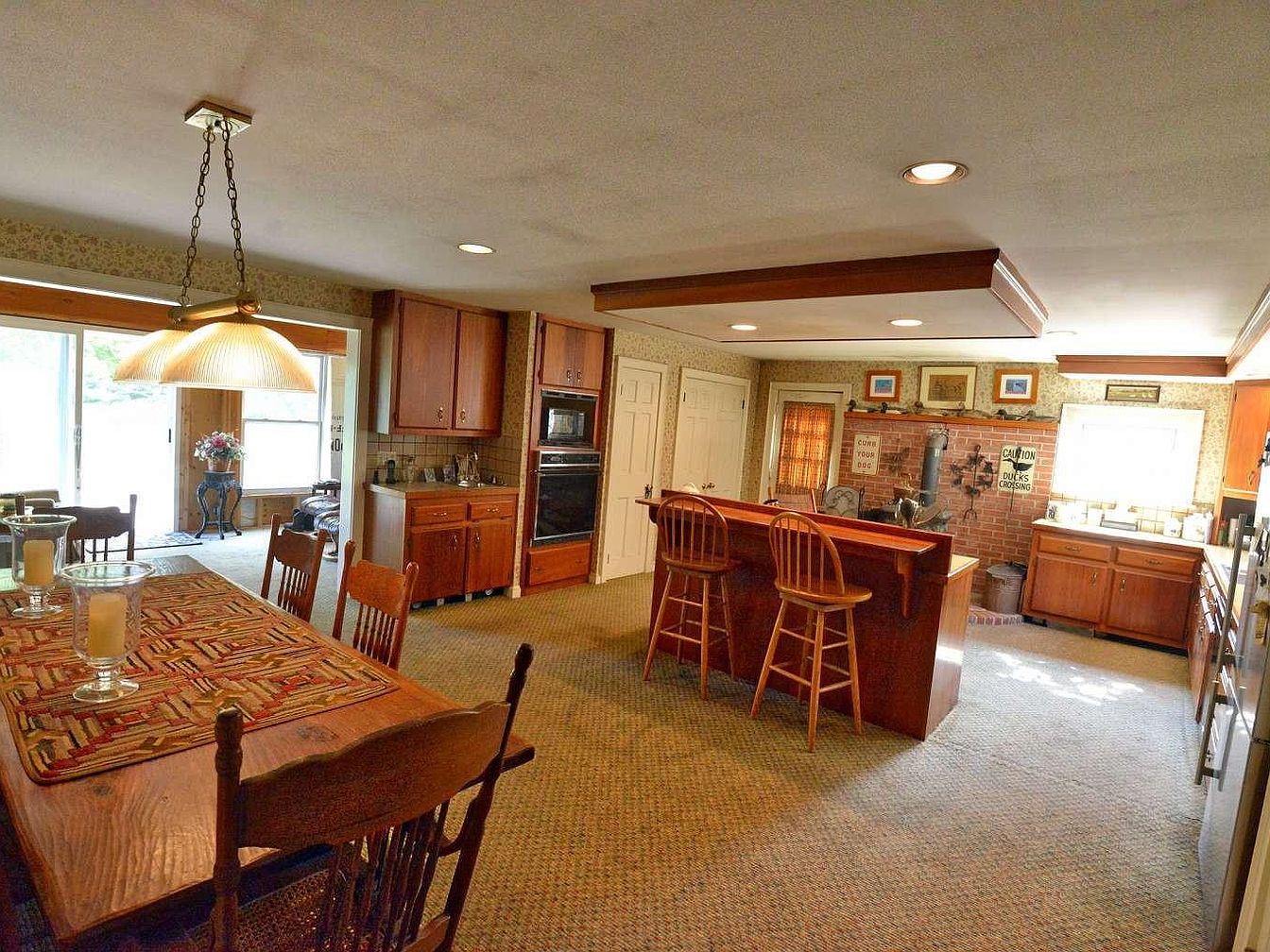 A spacious kitchen with an open layout featuring a central wooden island surrounded by two barstools. The warm wooden cabinetry complements the rustic charm of the space, highlighted by a patterned table runner on a large dining table. The room is illuminated by a pendant light, offering a soft glow. Textured walls adorned with floral wallpaper diffuse light from the windows, while subtle green accents create a serene atmosphere. A brick fireplace serves as a cozy focal point, enhancing the inviting feel of the kitchen. Overall, the design blends functionality and warmth, ideal for gatherings and daily use.
