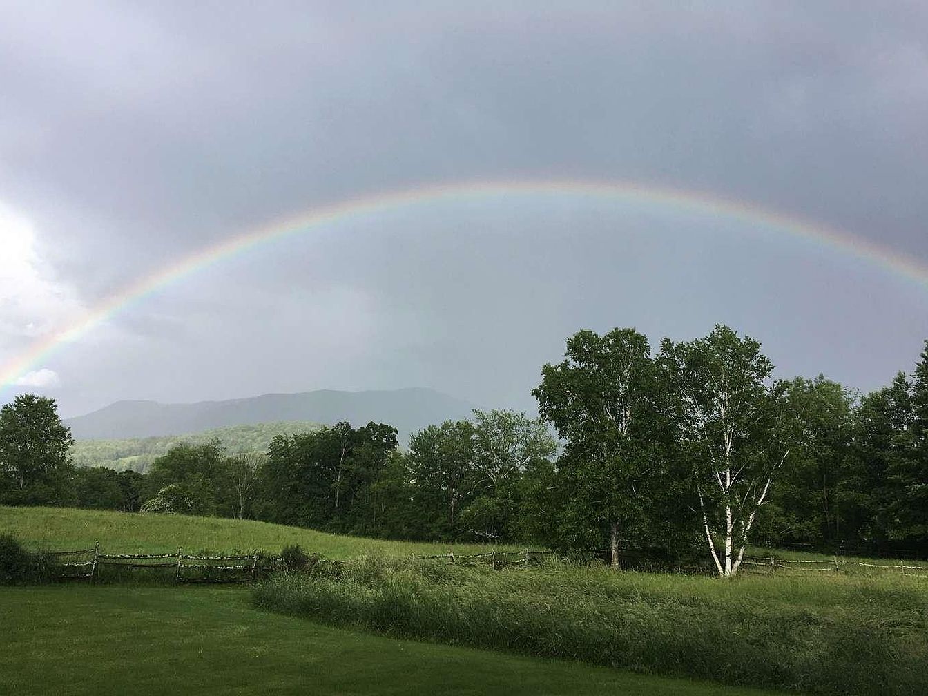 A serene landscape featuring a sweeping view of lush green fields and a rainbow arching across a cloudy sky. In the foreground, vibrant grasses sway slightly in the breeze, with a neatly maintained lawn. Several trees dot the scenery, including a striking white birch with slender trunks. The backdrop reveals rolling mountains cloaked in fog, blending blues and greens with the overcast sky. A rustic wooden fence curves gently, uniting the landscape and imparting a sense of tranquility. The overall aesthetic exudes peacefulness, inviting reflection and appreciation of nature’s beauty.