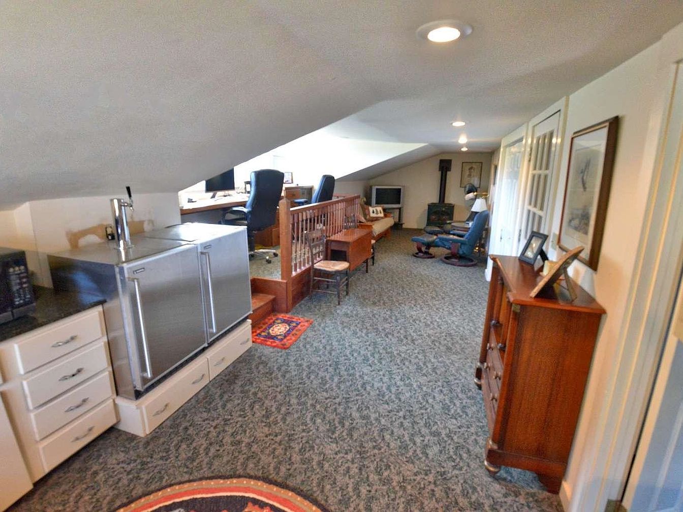 This attic space features a cozy, multifunctional layout with sloped ceilings that enhance the room’s charm. A light beige carpet provides warmth against the backdrop of the white walls. On one side, a stainless steel fridge contrasts modernity with wooden furniture, including a desk and chairs, positioned to create a work area. Decorative accents, including framed art and a patterned area rug, add character. Natural light filters in through windows, illuminating the space. The mix of classic and contemporary elements invites productivity with a hint of nostalgic comfort, making it an inviting retreat within the home.