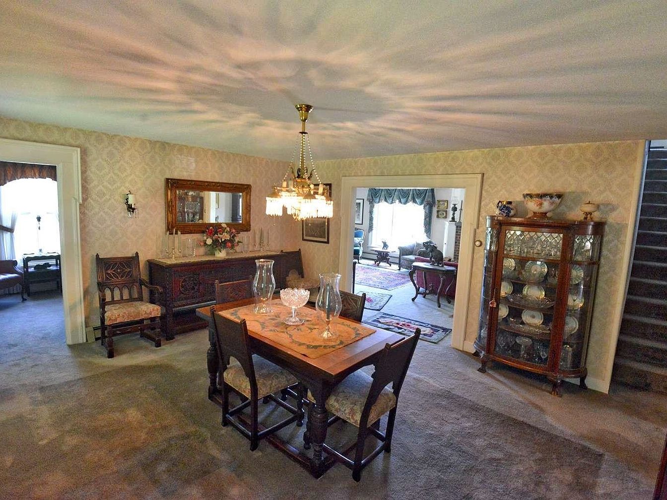 This dining room features an elegant wooden table adorned with a floral centerpiece, surrounded by intricately carved chairs, each with plush upholstery. The color palette transitions from soft creams to deep browns, complemented by patterned wallpaper that enhances the vintage charm. A crystal chandelier casts a warm glow, illuminating the space while reflecting off the polished sideboard adorned with decorative vases. A nearby glass cabinet showcases delicate china, while the carpet adds warmth and coziness underfoot. The open layout flows into a cozy sitting area, making this space inviting for gatherings and formal meals.