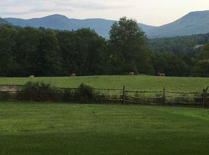 This image showcases a scenic outdoor landscape, likely viewed from a home. Rolling green fields extend across the foreground, dotted with soft patches of grass. In the distance, a series of lush mountains creates a stunning backdrop, their silhouettes softly faded by a gentle mist. A wooden fence lines the edge of the field, connecting nature to the structured elements of the property. The scene is tranquil, emphasizing a harmonious relationship between the cultivated land and the surrounding wilderness, while three deer gracefully graze, adding a touch of wildlife charm to this idyllic setting.