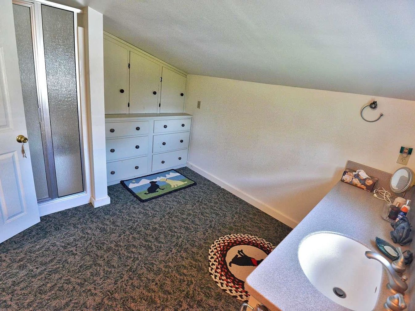 The bathroom features a compact layout with a sloping ceiling that adds character. A corner shower with frosted glass provides a modern touch while maximizing space. Light-colored cabinets with simple black knobs sit atop a countertop, offering ample storage. A textured rug depicting a dog adds a playful charm to the room, contrasting with the muted dark green carpet. A mirror sits beside toiletries organized neatly, showcasing a practical yet stylish arrangement. The overall color scheme is light and airy, with soft whites and muted tones, creating a welcoming and functional space.
