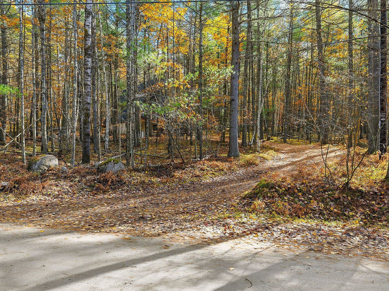 A gently curving driveway leads into a serene, wooded area, ideal for families seeking privacy and a natural setting. The surrounding forest showcases tall, slender trees with trunks in varying shades of gray and brown, their leaves in warm autumn hues of gold, amber, and green. Soft sunlight filters through the tree canopy, scattering dappled light over a forest bed blanketed with leaves. Large moss-covered rocks and small bushes add to the rustic charm. This outdoor space offers ample room for children to explore, play, and enjoy nature safely within view of home, perfect for outdoor family activities year-round.
