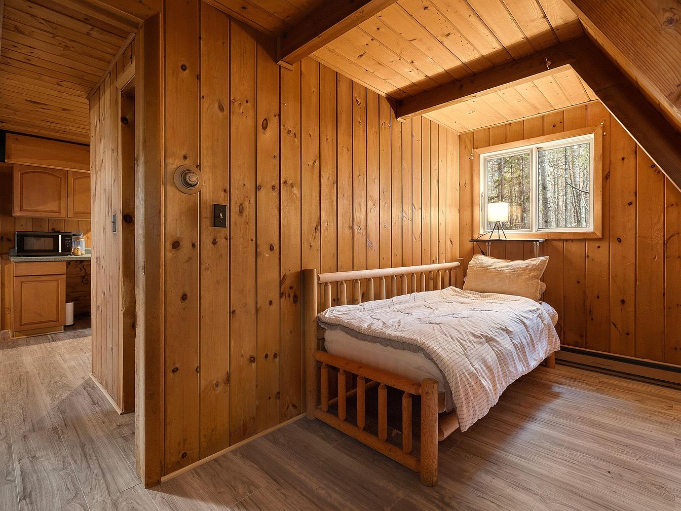 Cozy and inviting bedroom nook featuring warm wooden paneling on the walls and ceiling, creating a rustic and natural atmosphere ideal for family living. A twin-size log bed sits snugly beneath a large window, allowing sunlight to flood the space and offer serene views of the woodland outside. Soft, neutral bedding and a simple lamp on a nightstand add a touch of warmth and comfort. The layout maximizes use of space, perfect for children or guests, and smooth wood-grain flooring enhances the clean, low-maintenance feel. Just beyond, an open doorway leads to a kitchen area, adding convenience for family routines.