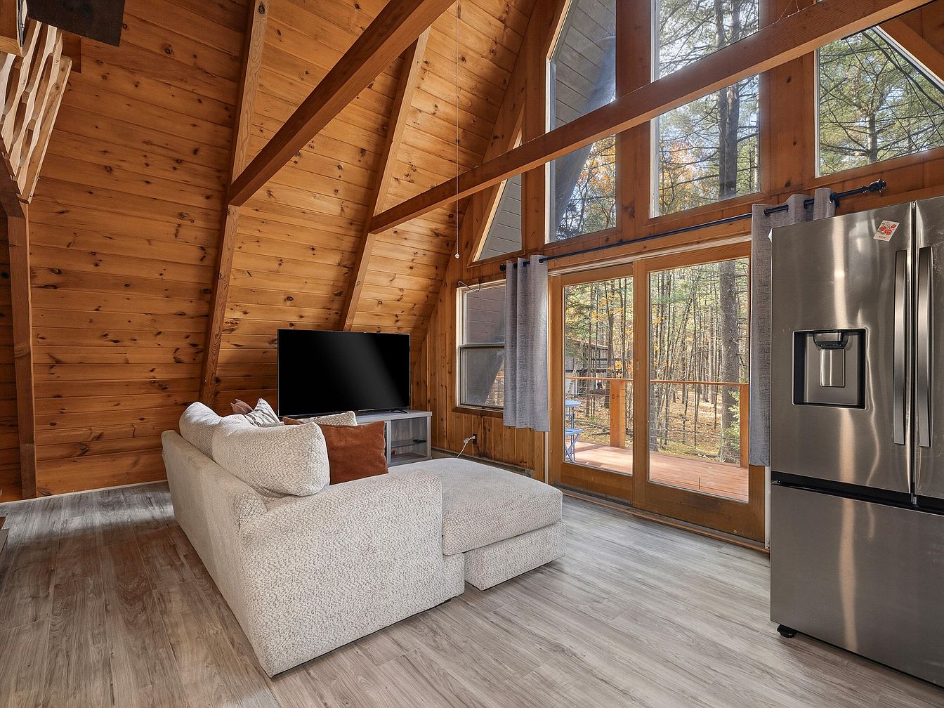 Spacious living area with a warm, rustic charm highlighted by exposed wood beams and walls made of natural wood paneling in a golden-brown tone, creating a cozy cabin feel. The high A-frame ceiling features large, triangular windows that welcome generous sunlight, brightening the room and providing serene views of the surrounding forest. A soft, U-shaped sectional couch in a neutral beige color provides ample seating for family gatherings. Modern touches include a flat-screen television on a sleek stand and a stainless steel refrigerator tucked into the open layout, making this space both family-friendly and functional for entertaining.